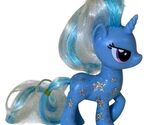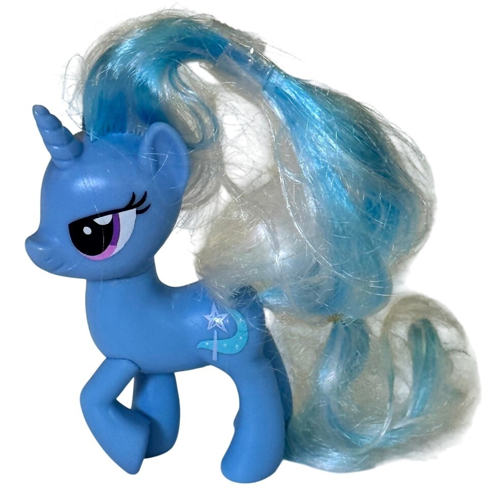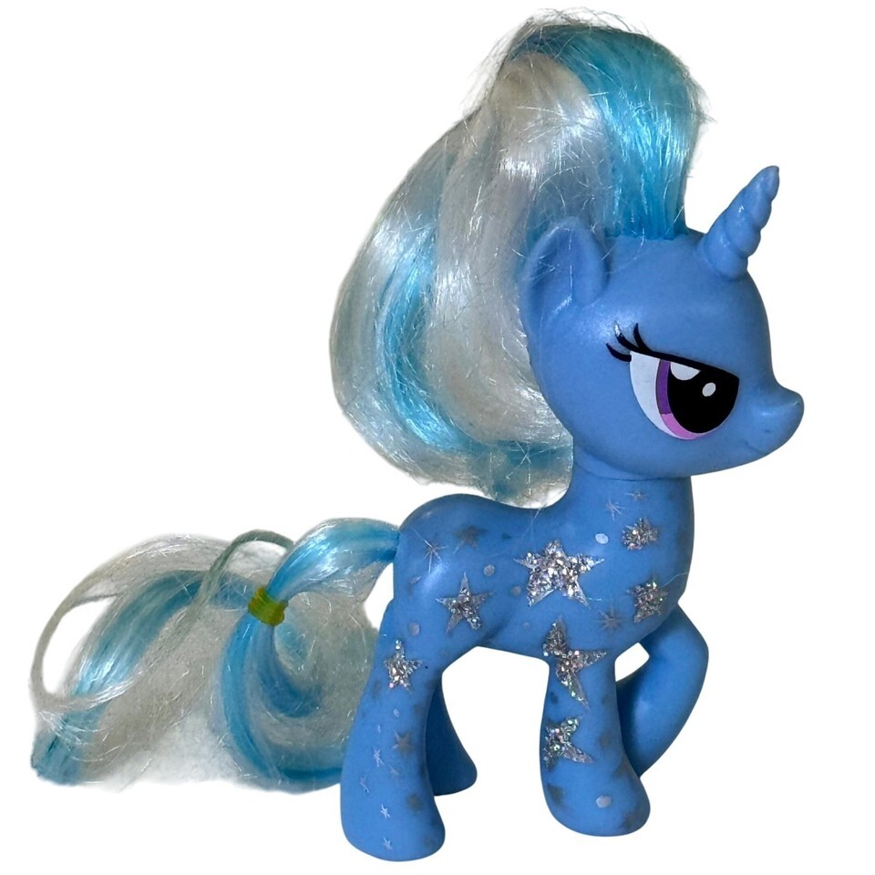 A shimmering original from Hasbro's Friendship Is Magic line ? this 2016 Trixie Lulamoon figure brings a touch of show-stopping sparkle! The confident blue unicorn features her trademark crescent moon and wand cutie mark and glittering silver stars across her body. With her pale blue-and-white mane and a hint of mischief in her eyes, she's ready to dazzle any collection. A classic G4 brushable from the beloved era of My Little Pony ? perfect for display or nostalgia-driven fans. ? Character: Trixie Lulamoon ? Year: 2016 ? Hasbro G4 Friendship Is Magic ? Size: Approx. 3.25" tall ? Material: Plastic with rooted synthetic hair ? Condition: Minor glitter wear; colors bright and mane full