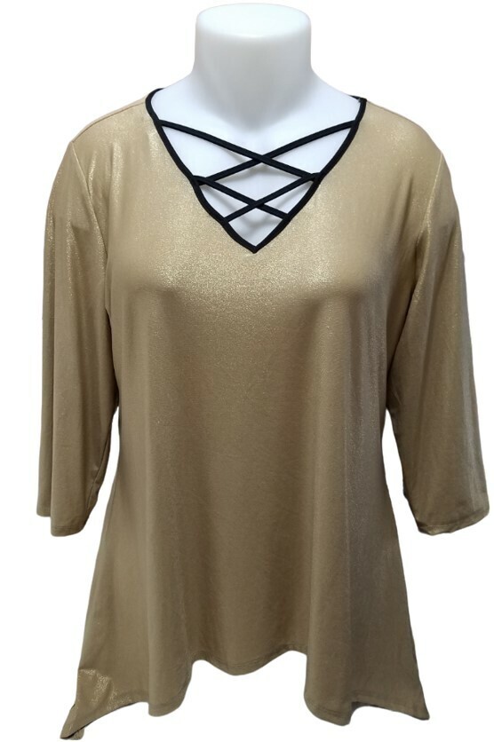 - NY Collection Asymmetrical Mocha Gold Glittery Lace-Up 3/4 Sleeve Blouse(Small)