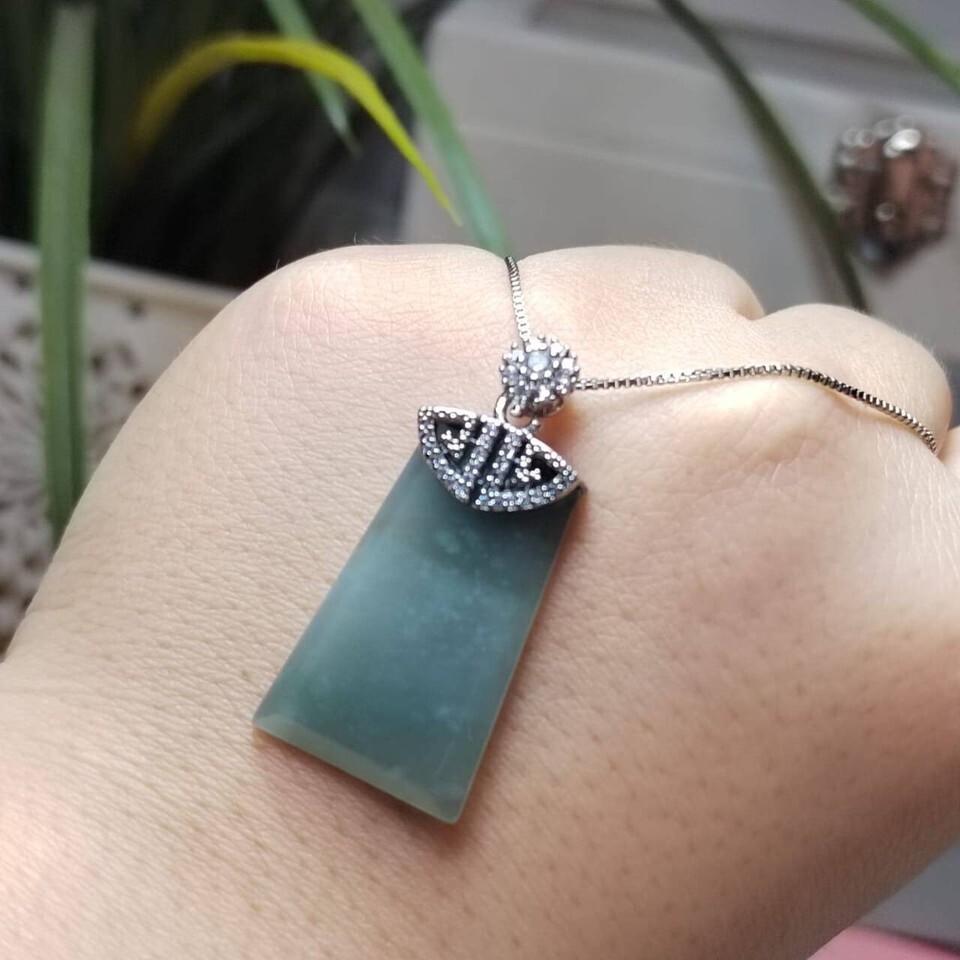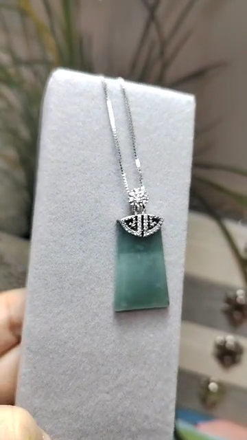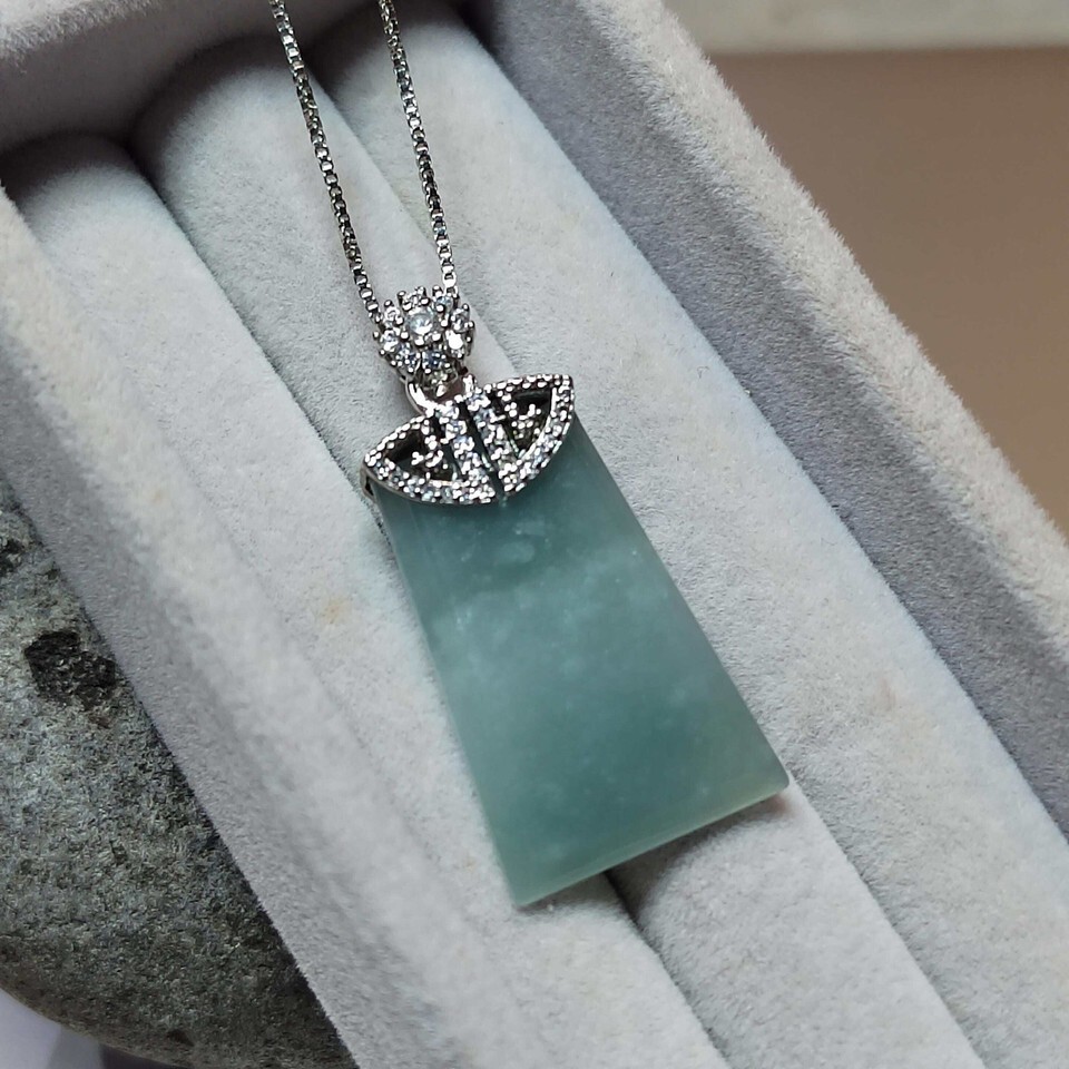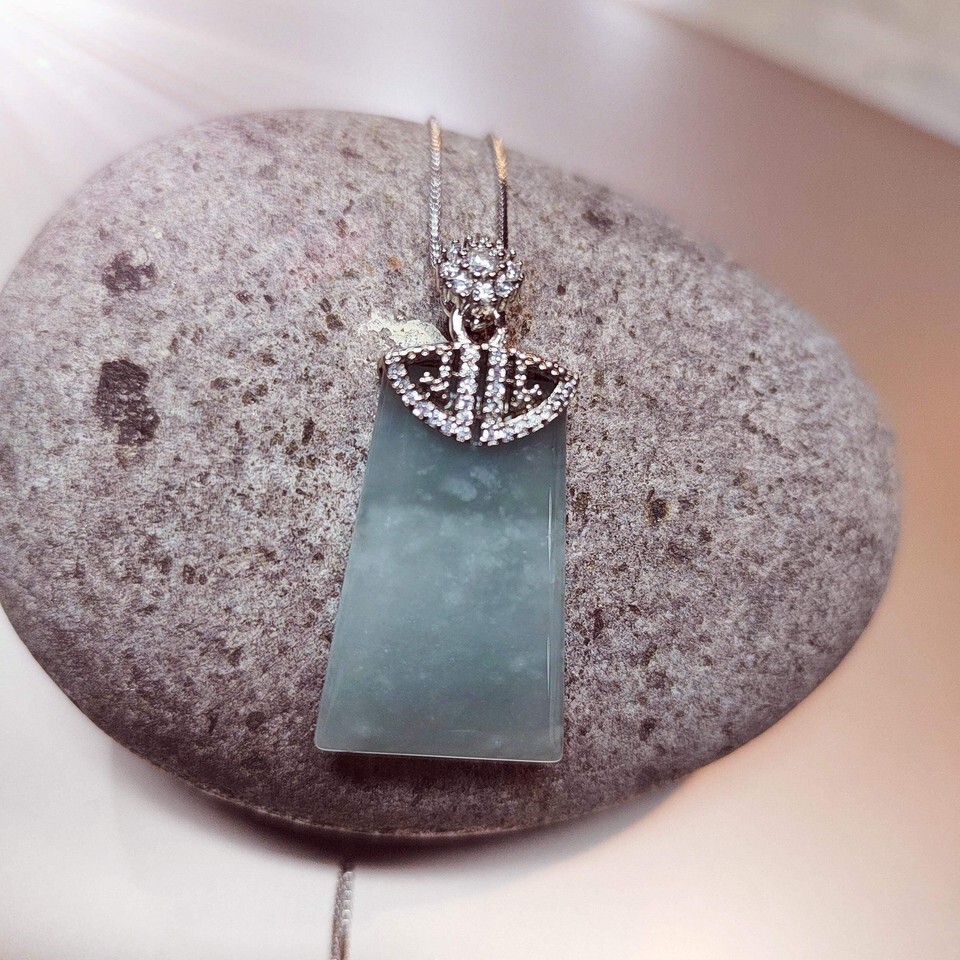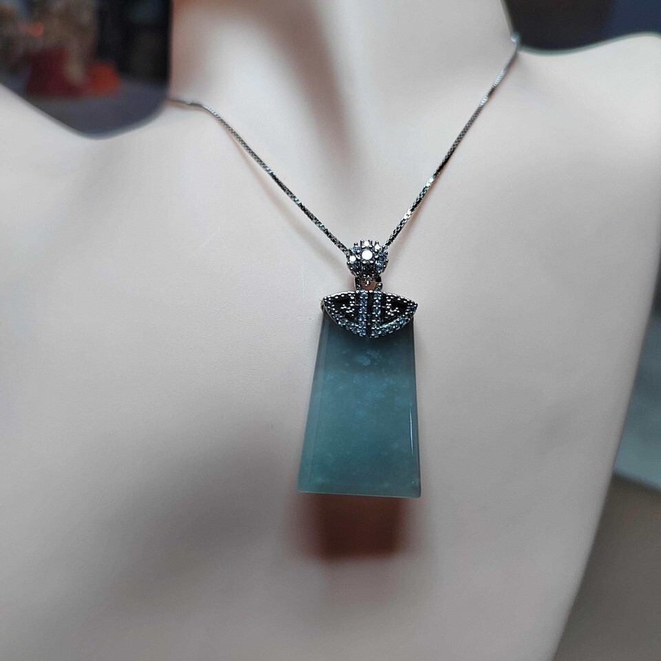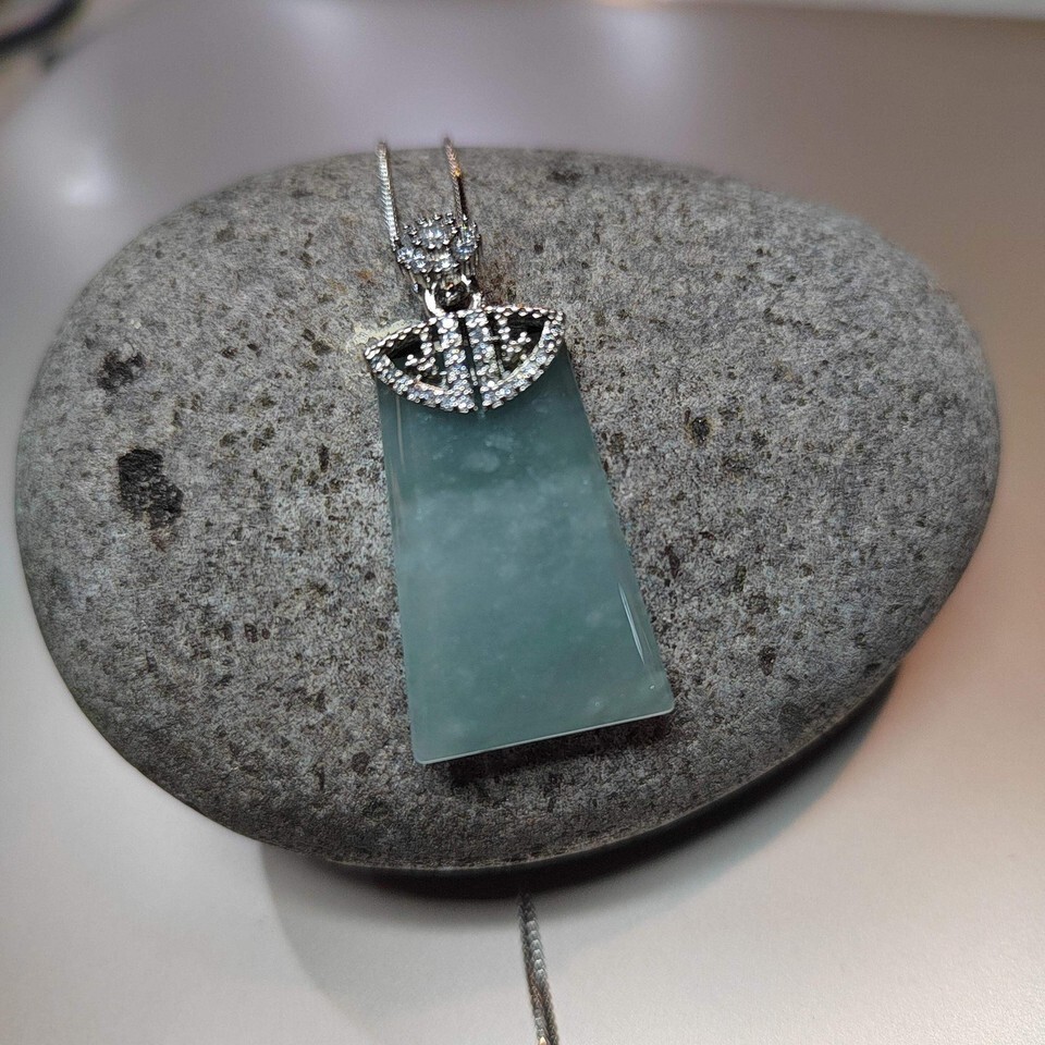 Adorn yourself with the serene beauty of this A-grade natural jadeite pendant, featuring a rare trapezoid cut and a captivating blend of icy white, soft green, and blue sky hues. Paired with a complimentary 925 sterling silver chain, this pendant is a timeless statement of elegance, artistry, and spiritual depth.