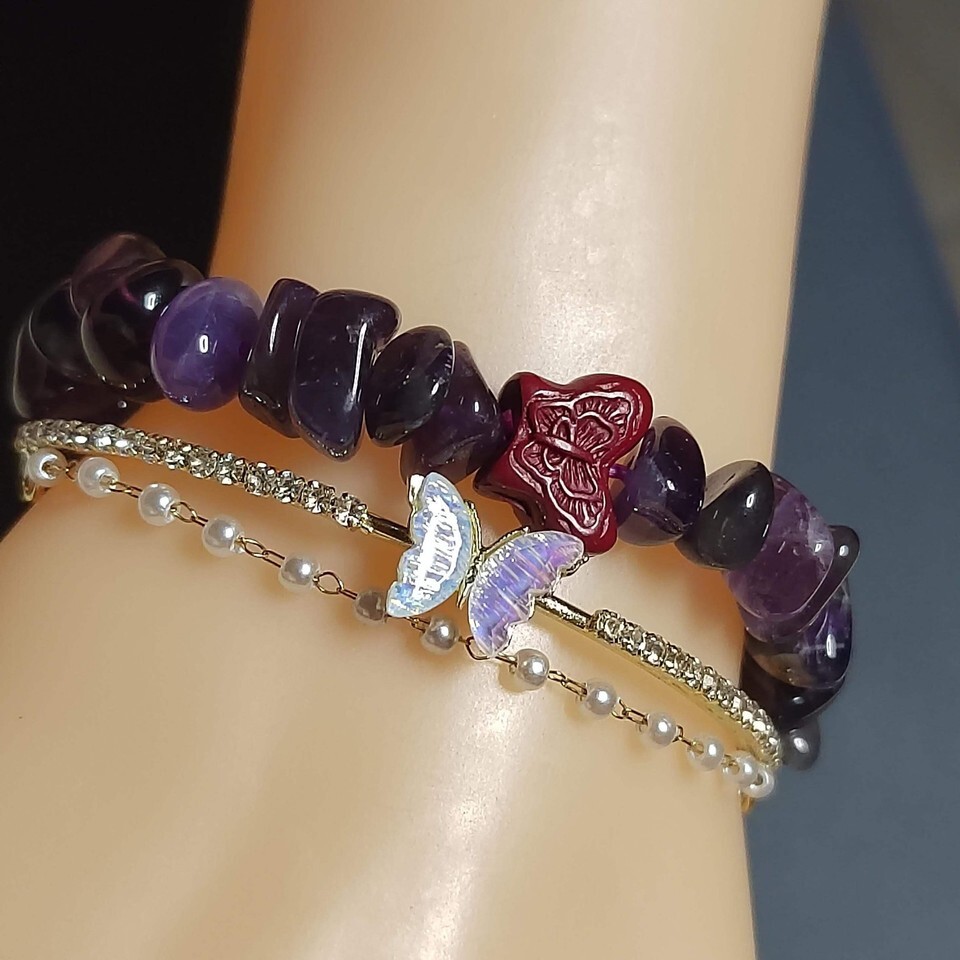 Add a touch of whimsy and elegance to your accessory collection with this beautifully layered bracelet set. Featuring rich purple amethyst beads, a vibrant cinnabar butterfly charm, a sparkling rhinestone accent bracelet, and a dainty pearl strand—each piece is designed to be worn together or styled separately for endless versatility.