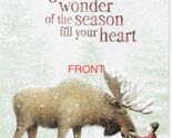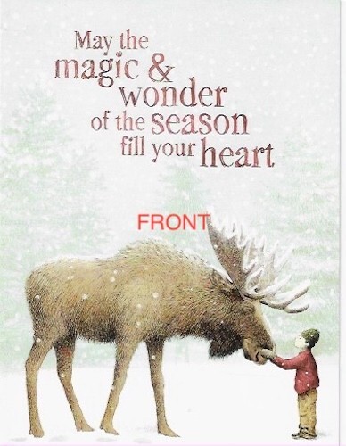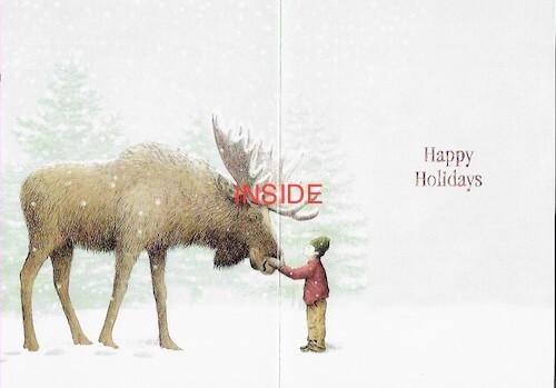 A child meeting a docile moose in the peace of the season! Words inside "Happy Holidays?.