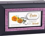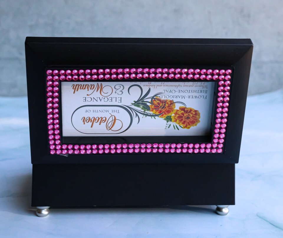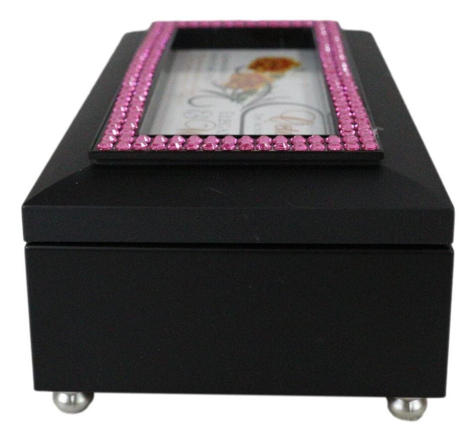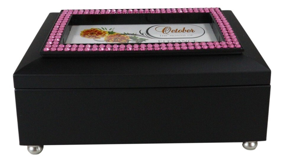 ? Beautiful birthstone jeweled photo frame lid and sweet word sentiment art gives this wooden music box a timeless appeal. Personalize this black box by replacing the sentiment artwork with 4 x 2 inch photo. Box is lined with protective rich velvet and padded feet. Quality hinges keep the lid upright when opened. Comes in nice packaging for easy wrapping. Attractive pretty jewels and gems from a border around the sentiment card.