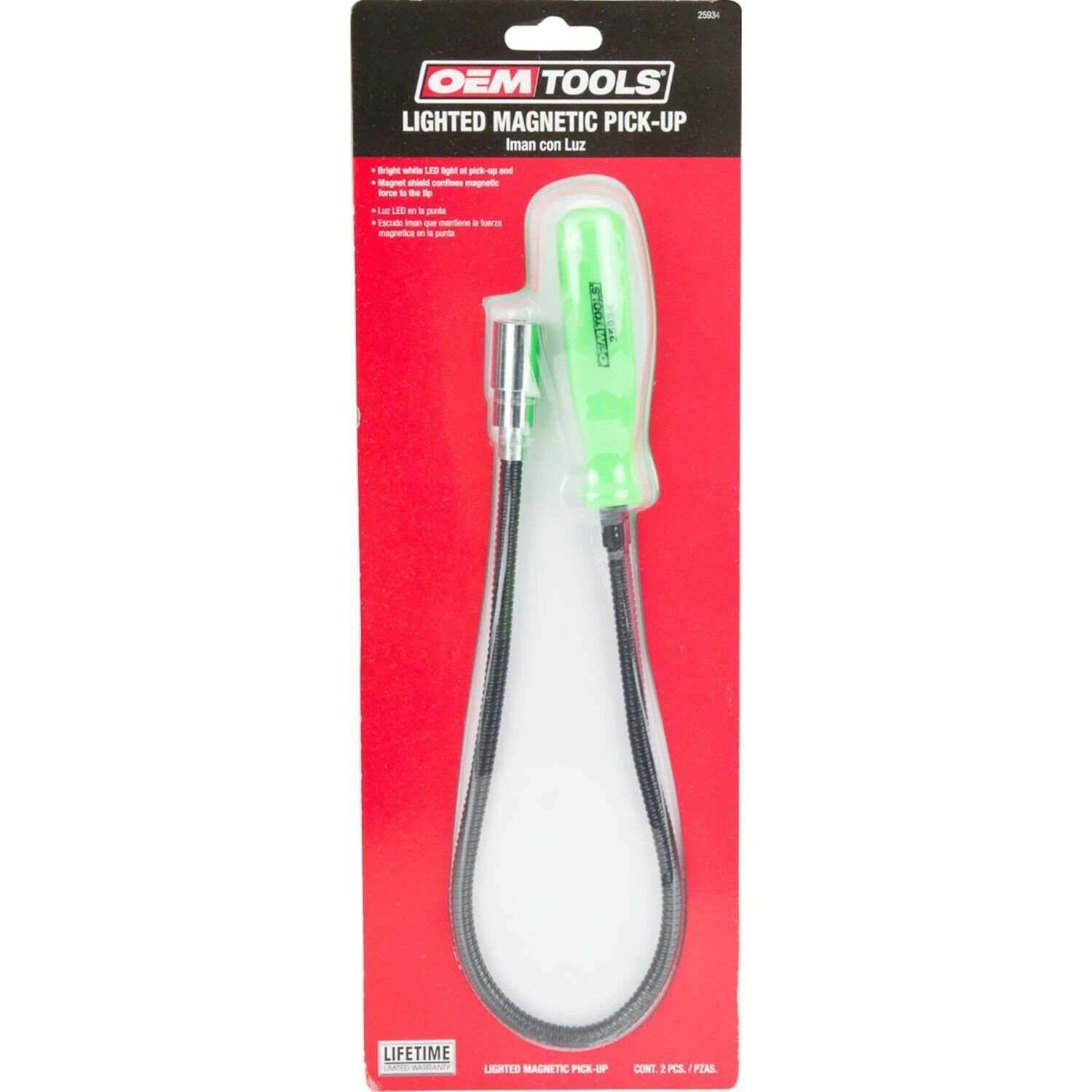 You are Buying a brand New And Factory Sealed OEMTOOLS Flex Lighted Pick Up Tool # 25934. PRODUCT DESCRIPTION The OEMTOOLS Lighted Magnetic Pick-up Tool is designed with a flexible shaft for hard-to-reach spots. It features a super-strong magnet ideal for picking up ferrous metal objects up to 5 lb. The bright LED light at the end of the tool is perfect for locating objects in dark areas. Bright White LED Light at Pick-up End Magnetic Shield Confines Magnetic Force to the Tip Flexible Shaft for Hard-to-Reach Spots Uses 3 Button Cell Batteries (357/SR4 Included).
