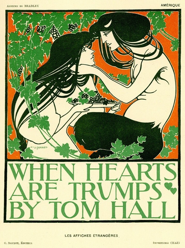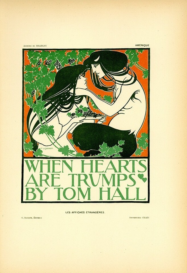 Original 1897 multi-color stone lithograph by Will BRADLEY "When Hearts are Trumps"? Les Affiches Etrangeres, Signed in the stone, Published by Imprimerie Chaix in Paris, One of Edition of 1050 Copies Les Affiches Etrangeres The 1890?s public were avid print collectors. The plates from Les Affiches Etrangeres were all done with the permission of the artist and by way of stone lithography at the Imprimerie Chaix in Paris in 1897 in a Limited Edition Printing of 1050 Copies This collection of full-color plates printed by Imprimerie Chaix feature the global lithographic feats of artists outside the bounderies of France, including representative works from Germany, England, Austria, Belgium, the United States and Japan. The original 1897 multi-color stone lithograph ? Not a copy or modern reprint