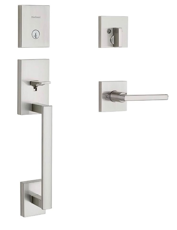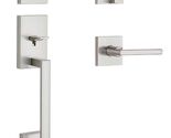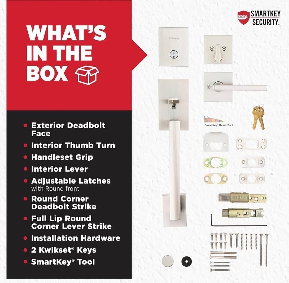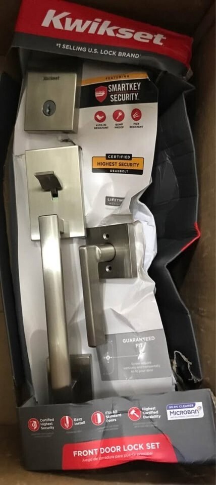 Open box and unused. Still in box see photos. Original plastic packaging is damaged or missing. Pack of 2! Kwikset San Clemente Front Door Lock Handle and Deadbolt Set, Entry Handleset Exterior with Interior Reversible Lever, Satin Nickel, Pick Resistant SmartKey Rekey Deadbolt Security