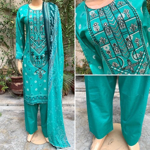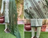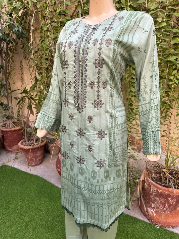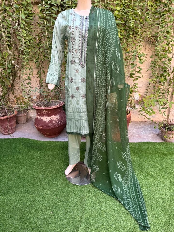 Pakistani Sage Green Printed Straight Shirt 3-PCS Lawn Suit w/ Threadwork ,XL