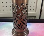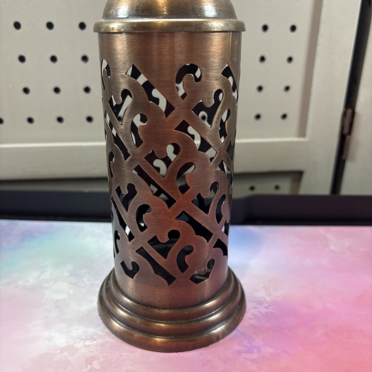 The Pier 1 One Reed Diffuser Vase/Accent in Brass Tone is a handmade copper candle holder that adds a touch of elegance and charm to any space. Standing at 7 inches tall, this unique piece is perfect for adding a warm and inviting ambiance to your home decor. Crafted with attention to detail and a touch of sophistication, this vase accent is sure to enhance the overall aesthetic of your living space.
