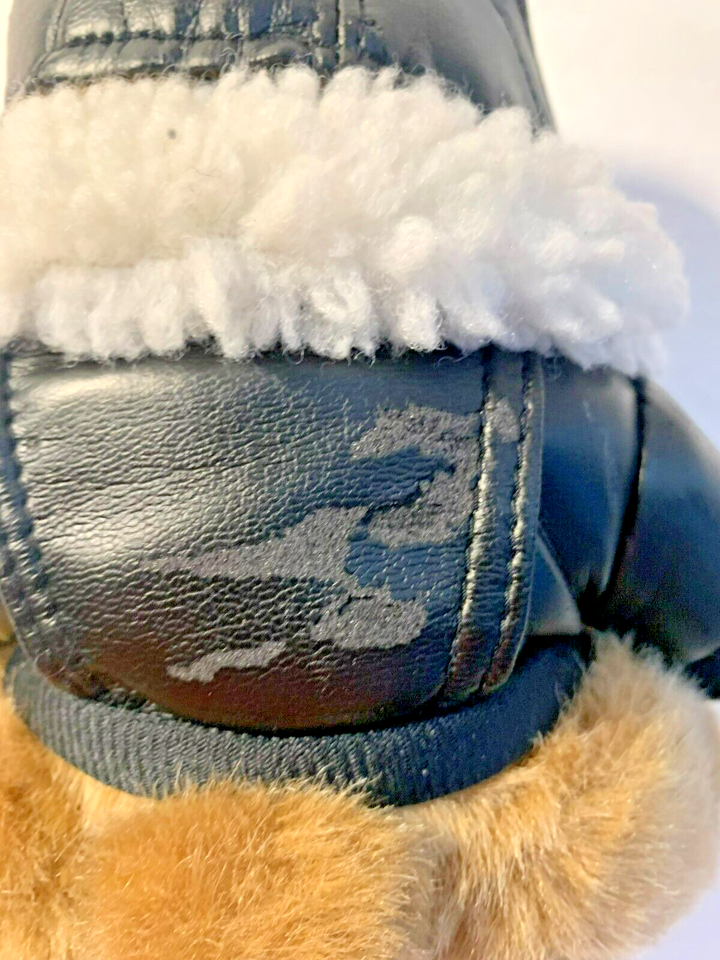 This cute flyboy bear is about 6 inches tall, there are some blemishes on the back of the leather outfit