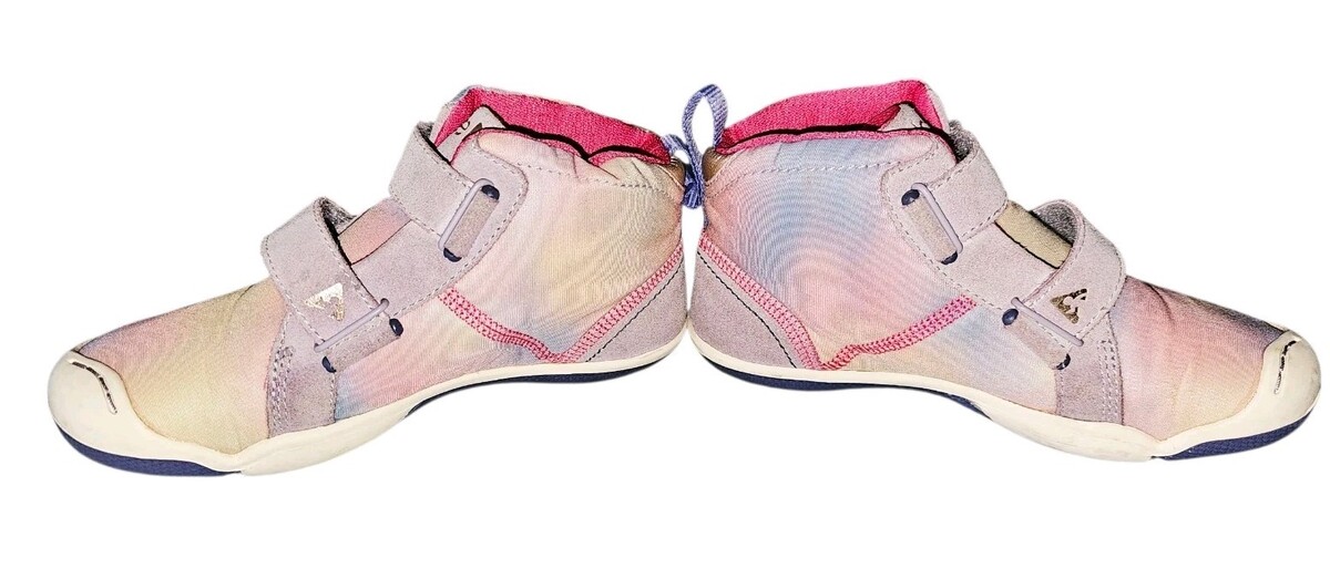 The Plae Max Fun Puffy Wrinkled Aurora Sneakers are stylish high-top shoes designed for girls toddlers in size 12.5. These sneakers feature a round toe shape, hook loop closure, and a flat heel for comfort. Made from blended fabric with a rubber outsole, these sneakers are perfect for travel, activewear, and casual occasions. The colorful and fun design with logo accents and a space theme make them a trendy choice for young girls who love to walk and stay active.