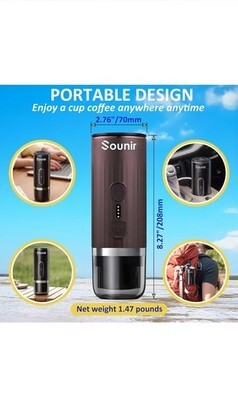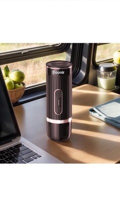 The Portable Electric Espresso Machine by Sounir is a sleek and compact coffee maker perfect for travel. With a powerful 20 bar pressure for delivering rich espresso, this machine operates on a rechargeable battery with a 5v voltage. The ABS plastic construction in bronze color makes it durable and easy to clean. The digital control panel and self-heating feature make it convenient for on-the-go use. Complete with a user manual, this espresso machine is a must-have for coffee lovers looking for a convenient and portable option for their road trips or outdoor adventures.