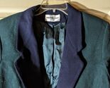 Ladies green wool coat with blue trim. Very nice feel. Has 2 front pockets