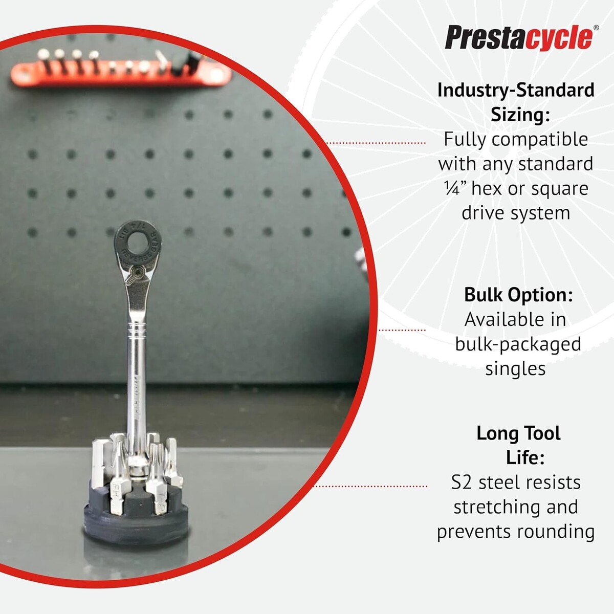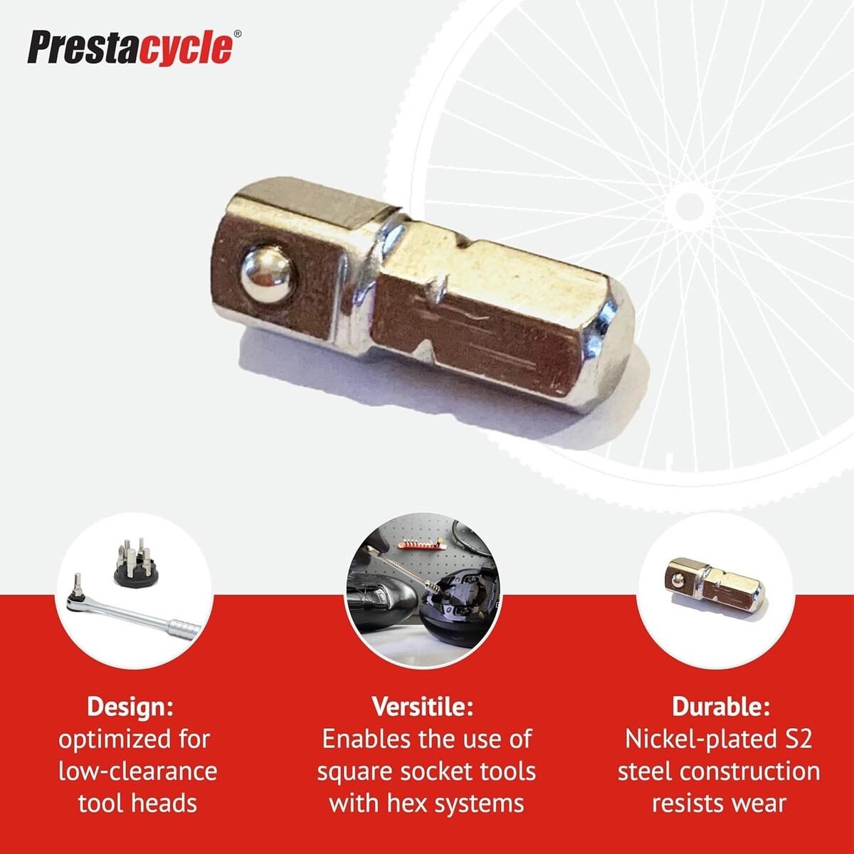 with all Prestacycle hex-bit hand tools as well as standard 1/4" hex bits and square sockets, this adapter ensures maximum compatibility and flexibility.