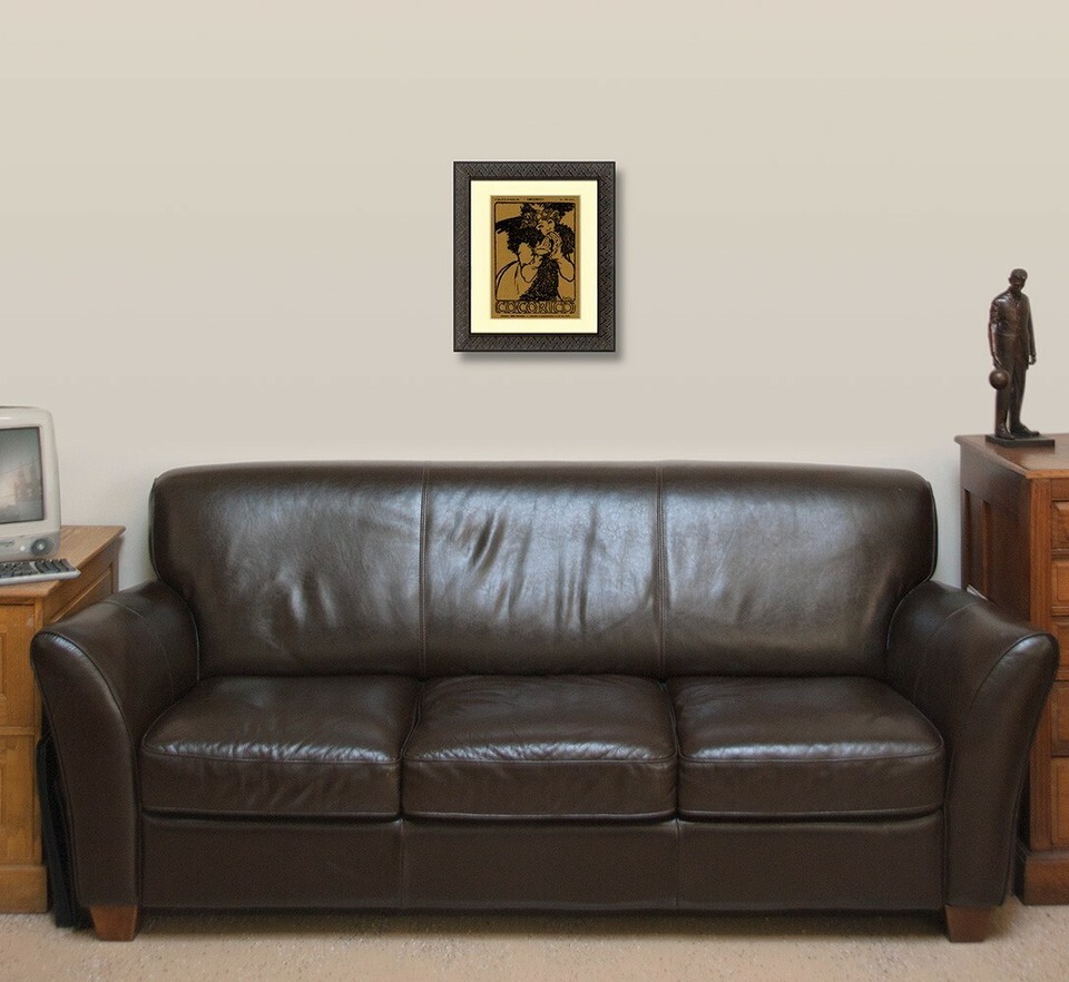 ? Mucha's striking woodcut in black ink on rough, thick brown textured cover for 1899 edition of Cocorico