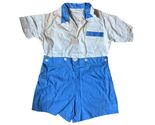 This charming outfit features a white top and bright blue pants, a classic color combination from the era. The shirt has three buttons down the front and a single pocket. The pants attach to the shirt with a total of eight buttons around the waist, ensuring a secure and tidy fit.