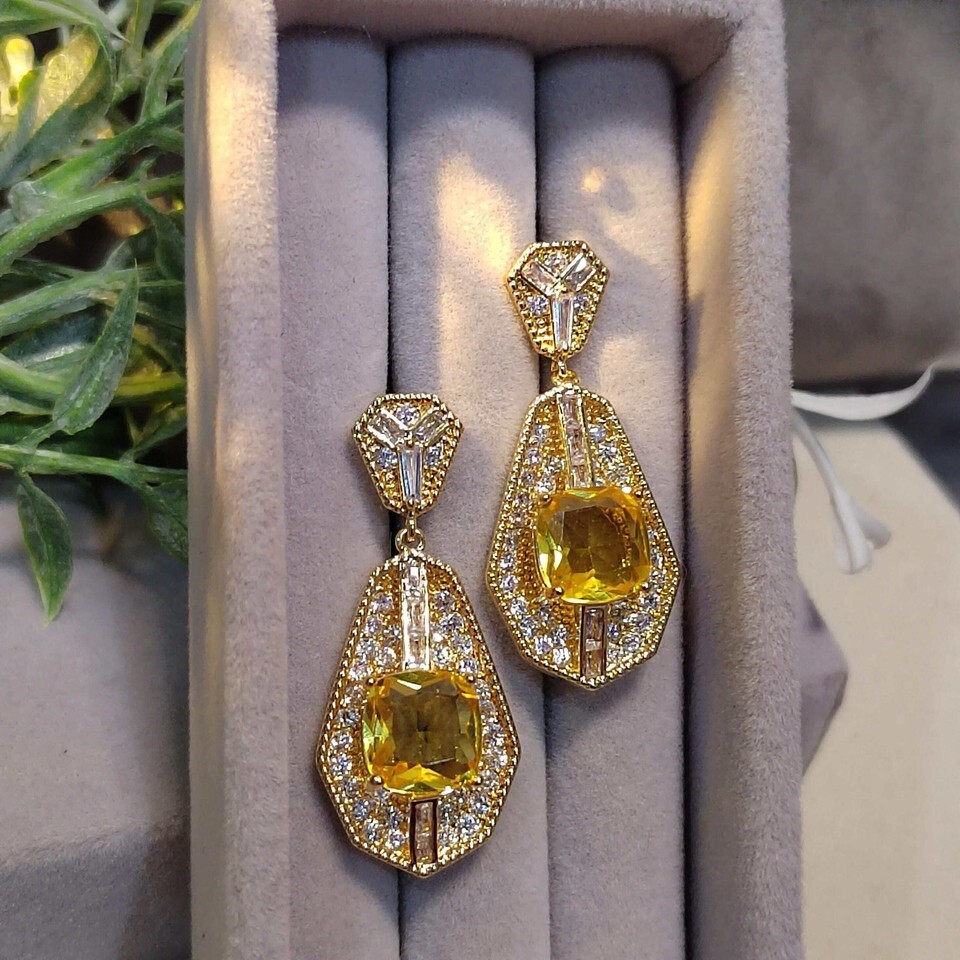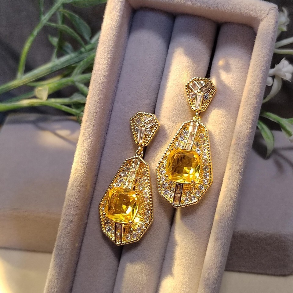 Elevate your style with these exquisite gold-plated stud earrings, featuring a sophisticated blend of white and vibrant yellow zircon stones set in a modern geometric design. Crafted with meticulous attention to detail and finished in real gold plating, these earrings offer timeless elegance for any occasion—from weddings and anniversaries to parties and casual outings.