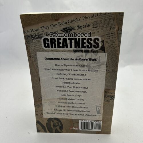 Comments About the Author's Work Sports Figures Come Alive Now I Remember Why I Love Sports So Much Definitely Worth Reading Great Book, Highly Recommended Terrrific Stories Awesome, Very Entertaining Wonderful Book, Great Gift Like Opening Day! Almost Makes You Cry Unusual and Informative It Makes These Heroes Human Like An Old Friend Telling Stories Purvis's Latest Book "Knocks It Out of the Park"
