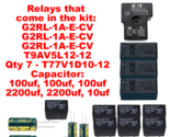 Relays that come in the kit: T9AV5L12-12, T77V1D10-12, T77V1D10-12, T77V1D10-12, T77V1D10-12, T77V1D10-12, T77V1D10-12, T77V1D10-12, G2RL-1A-E-CV, G2RL-1A-E-CV, G2RL-1A-E-CV Capacitors: 2200uf, 2200uf, 10uf, 100uf, 100uf, 100uf