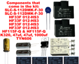 Relays that come in the kit: SLC-S-112DMK-F-30, SLC-S-112DMK-F-30, HF33F 012-HS3, HF33F 012-HS3, HF33F 012-HS3, HF33F 012-HS3, HF115F-Q, HF115F-Q, K320, TYN606, 47uf, 47uf, and 1000uf
