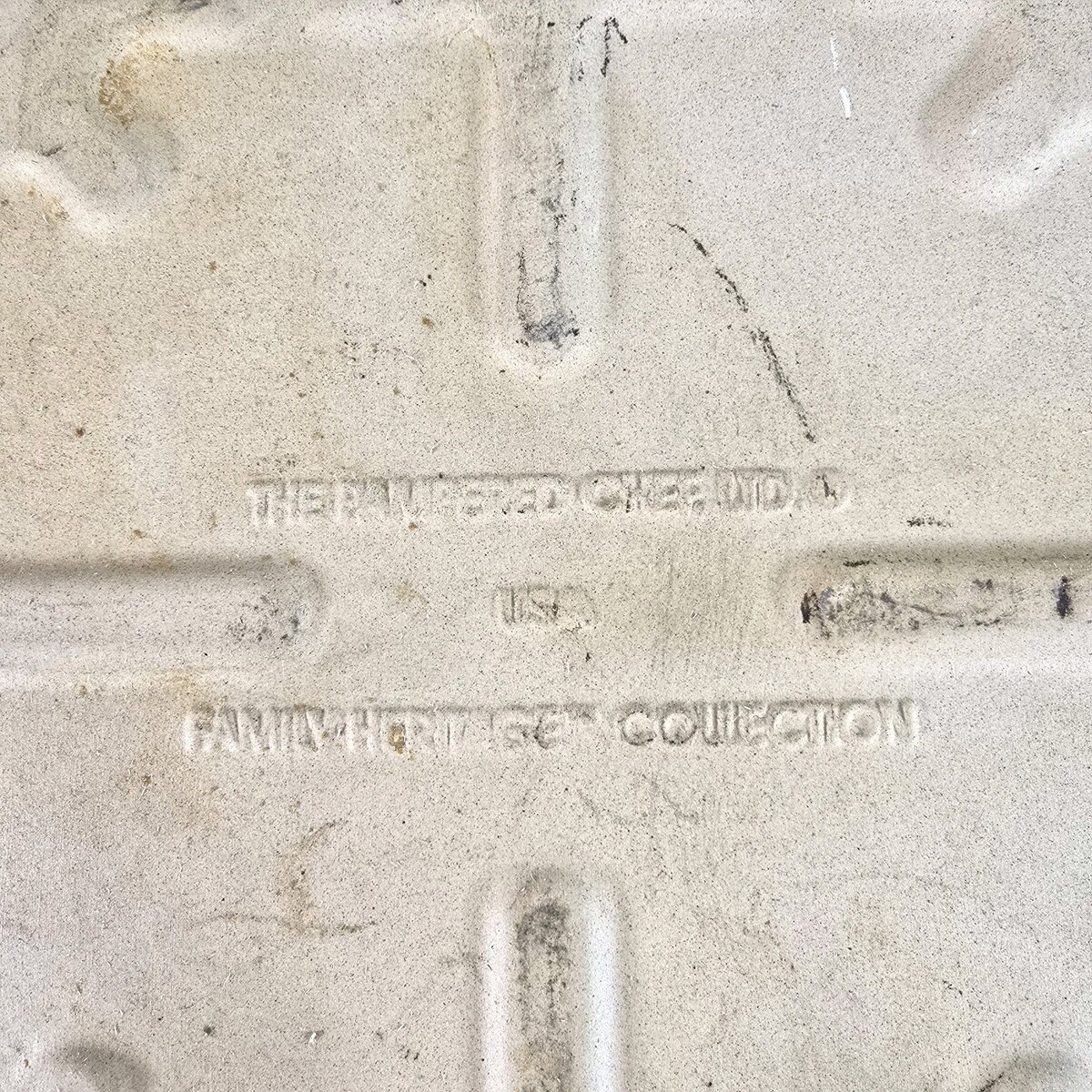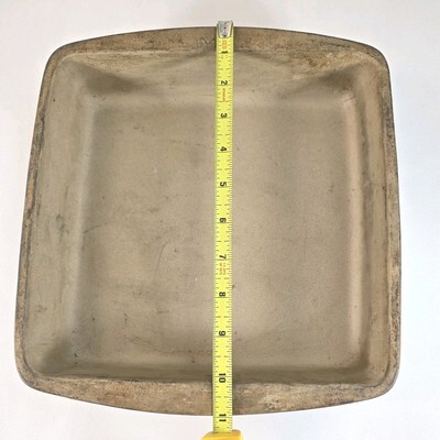 This is a retired Pampered Chef Family Heritage 9 x 9 x 2.5 stoneware square baker. It is a beige color and has a capacity of 2 qt. The baking dish is suitable for use in electric, gas, and pizza ovens. The surface coating is stoneware and the item weighs 2.1-11 lbs.