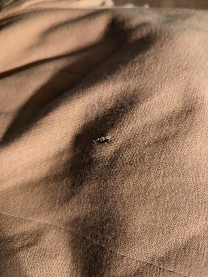 โHas a single small thread break in the back roughly 1/4" longโ |