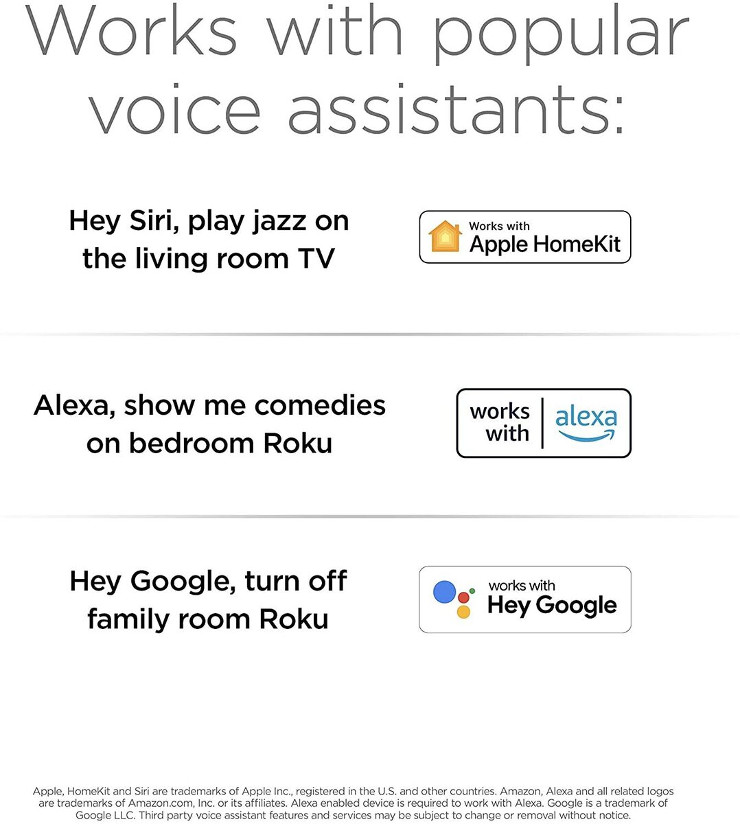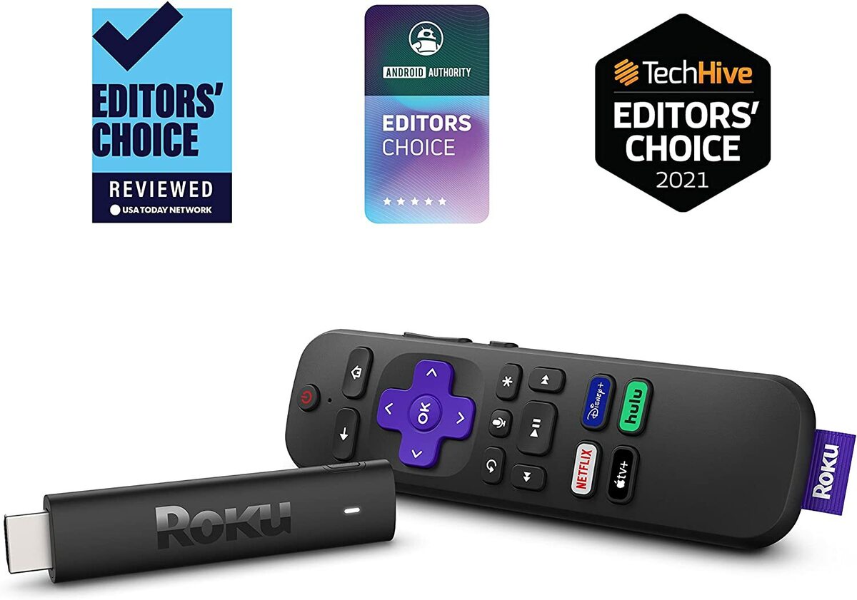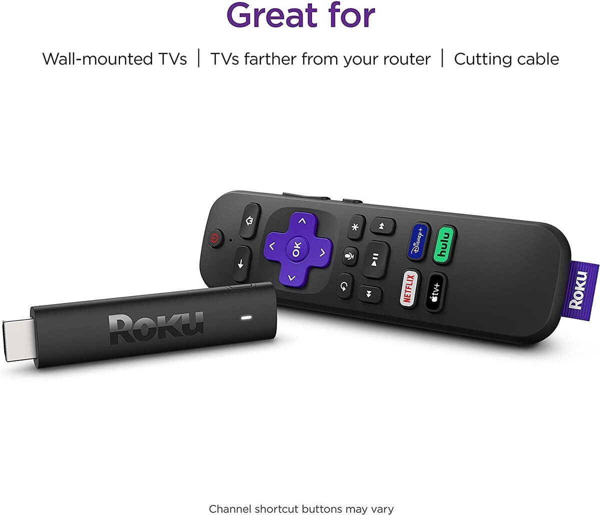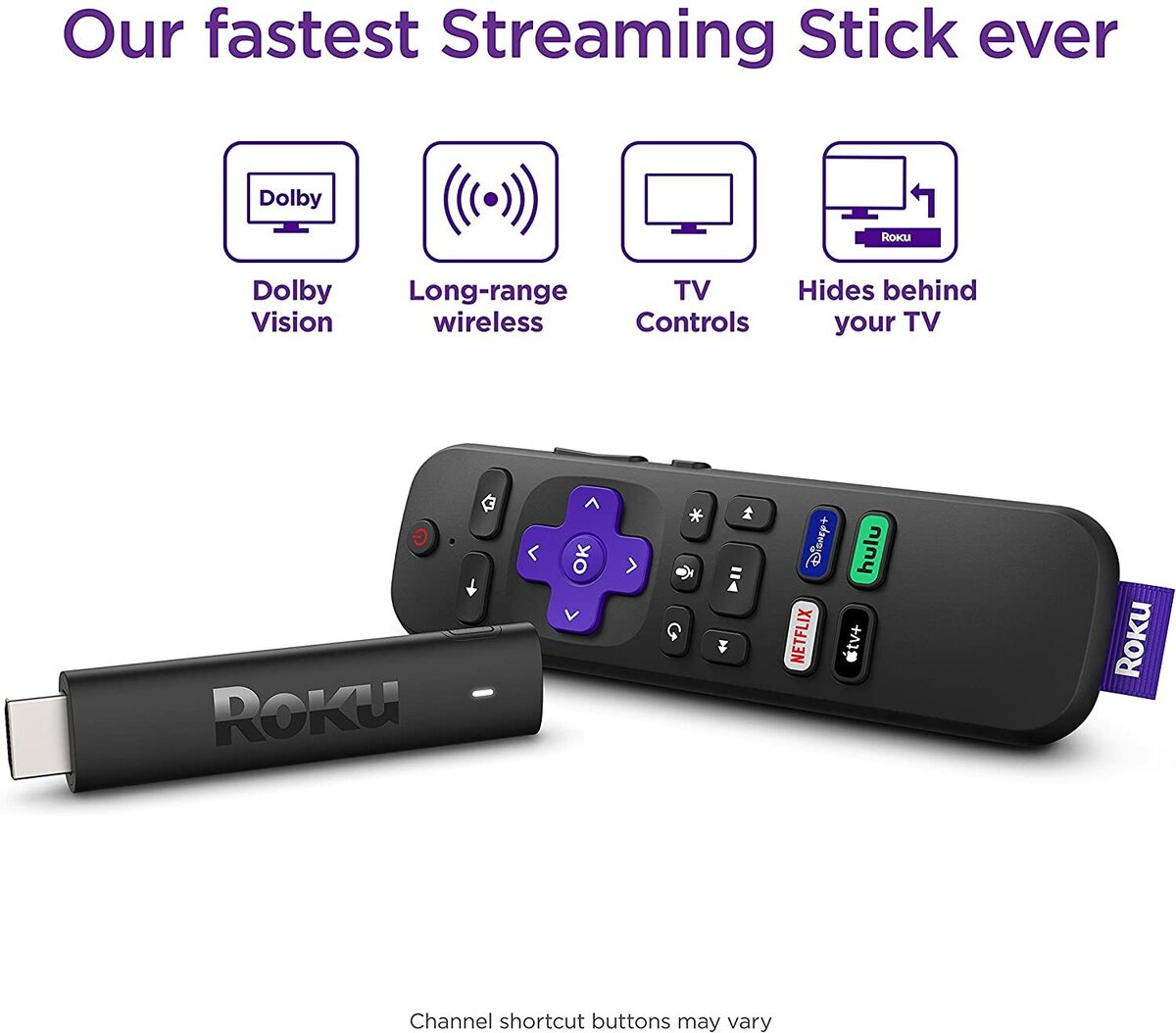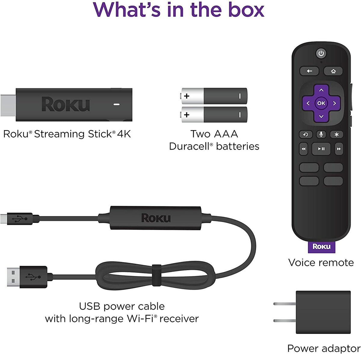 Roku Streaming Stick 4K | Streaming Device 4K/HDR/Dolby Vision with Roku Voice Remote and TV Controls Hides behind your TV: The all-new design plugs right into your TV with a simple setup Super-fast startup: Start streaming channels like Disney plus, Prime Video, HBO Max, Apple TV plus, Netflix, Sling, and Hulu in a snap?just turn on your TV Long-range Wi-Fi: Enjoy fast, smooth TV streaming in any room with a strong Wi-Fi connection, now up to 2x faster No more juggling remotes: Power up your TV, adjust the volume, and control your Roku Streaming Stick with the Roku remote Voice search control: Quickly search, play entertainment, and control your streaming device with the voice remote Breathtaking picture: Stream in 4K, Dolby Vision, and HDR10 plus with sharp resolution and vivid color Watch what you love: Upgrade your streaming with a massive selection of free, live, and premium TV, including Roku Originals and 275 plus free Live TV channels on The Roku Channel Works with popular voice assistants: Enjoy easy voice control with Siri, Alexa, and Google Assistant What's in the box Roku Streaming Stick 4K Voice remote Two AAA batteries USB power cable with Long-range Wi-Fi receiver Power adaptor