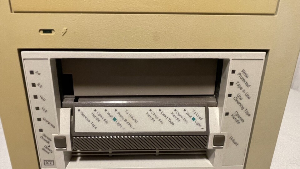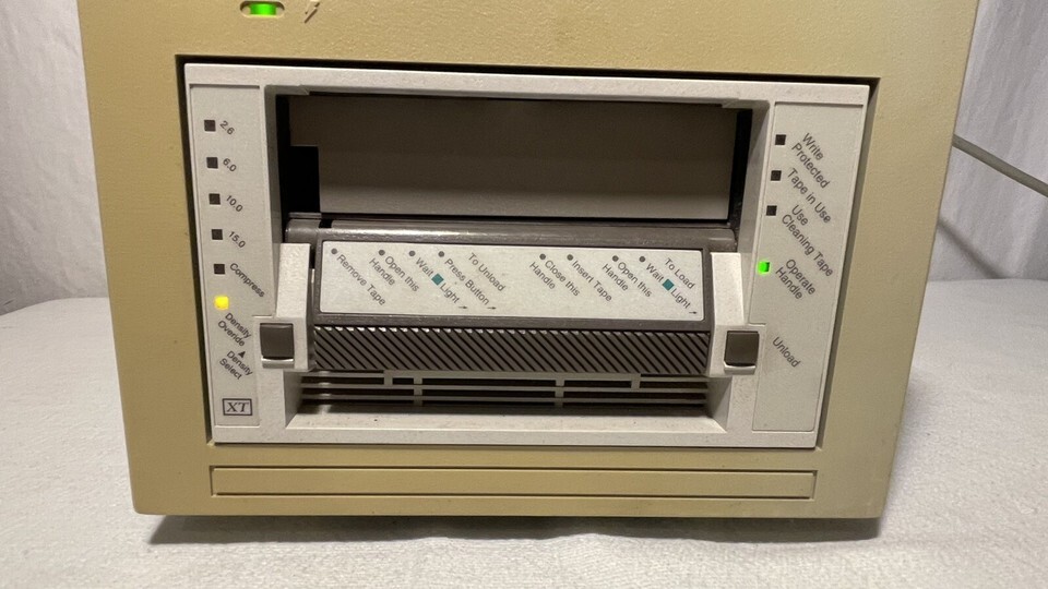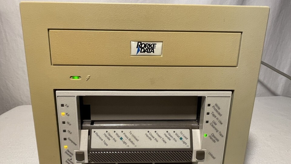This is a vintage RORKE DATA external tape drive model CI-2000-BK-CO designed for DLT tape storage. It is compatible with Sonic Solutions and is meant to be installed in a drive bay.