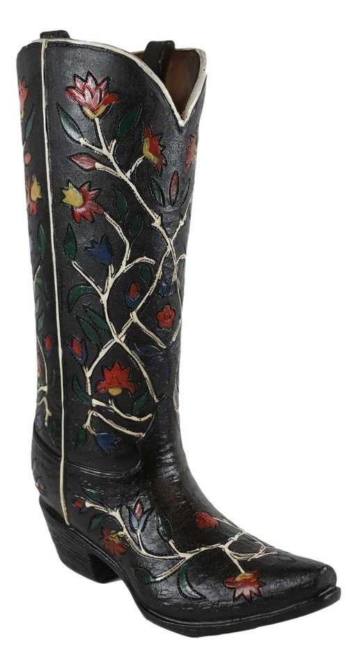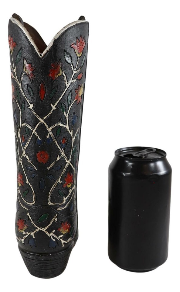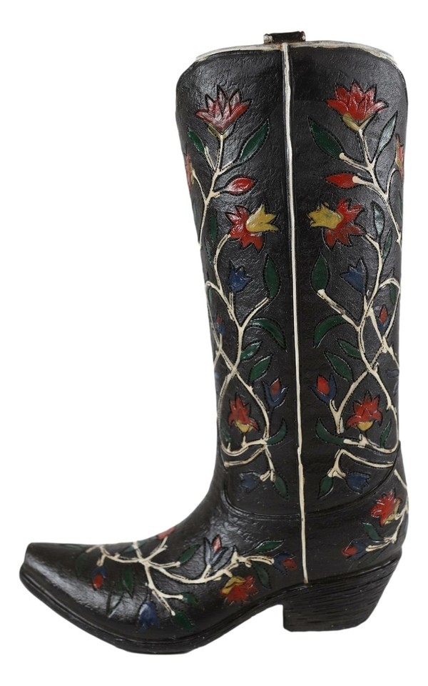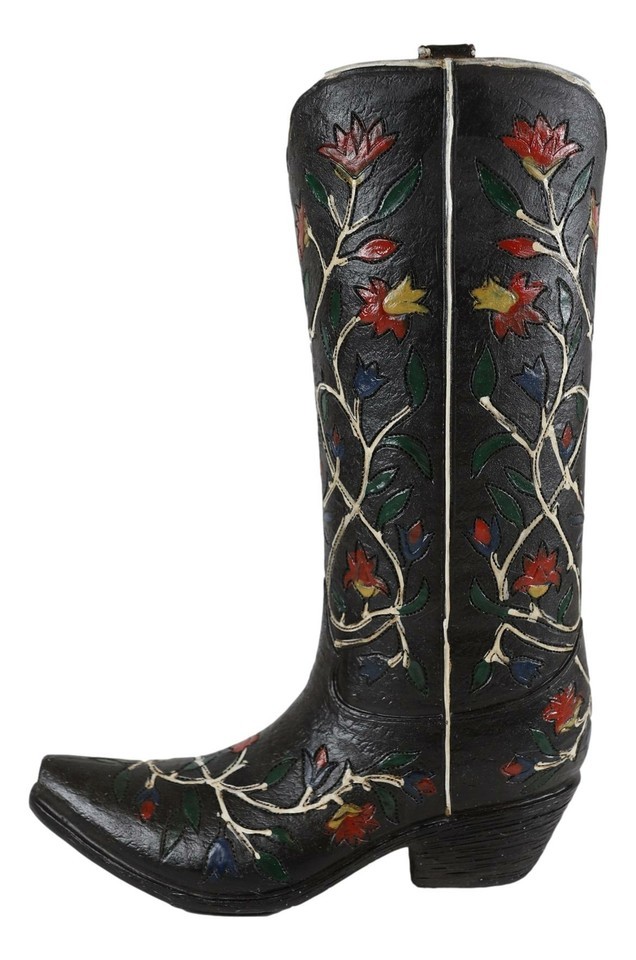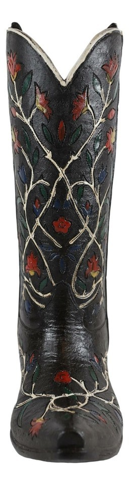 - Rustic Western Black Tooled Leather Cowboy Boot With Rose Vines Vase Figurine