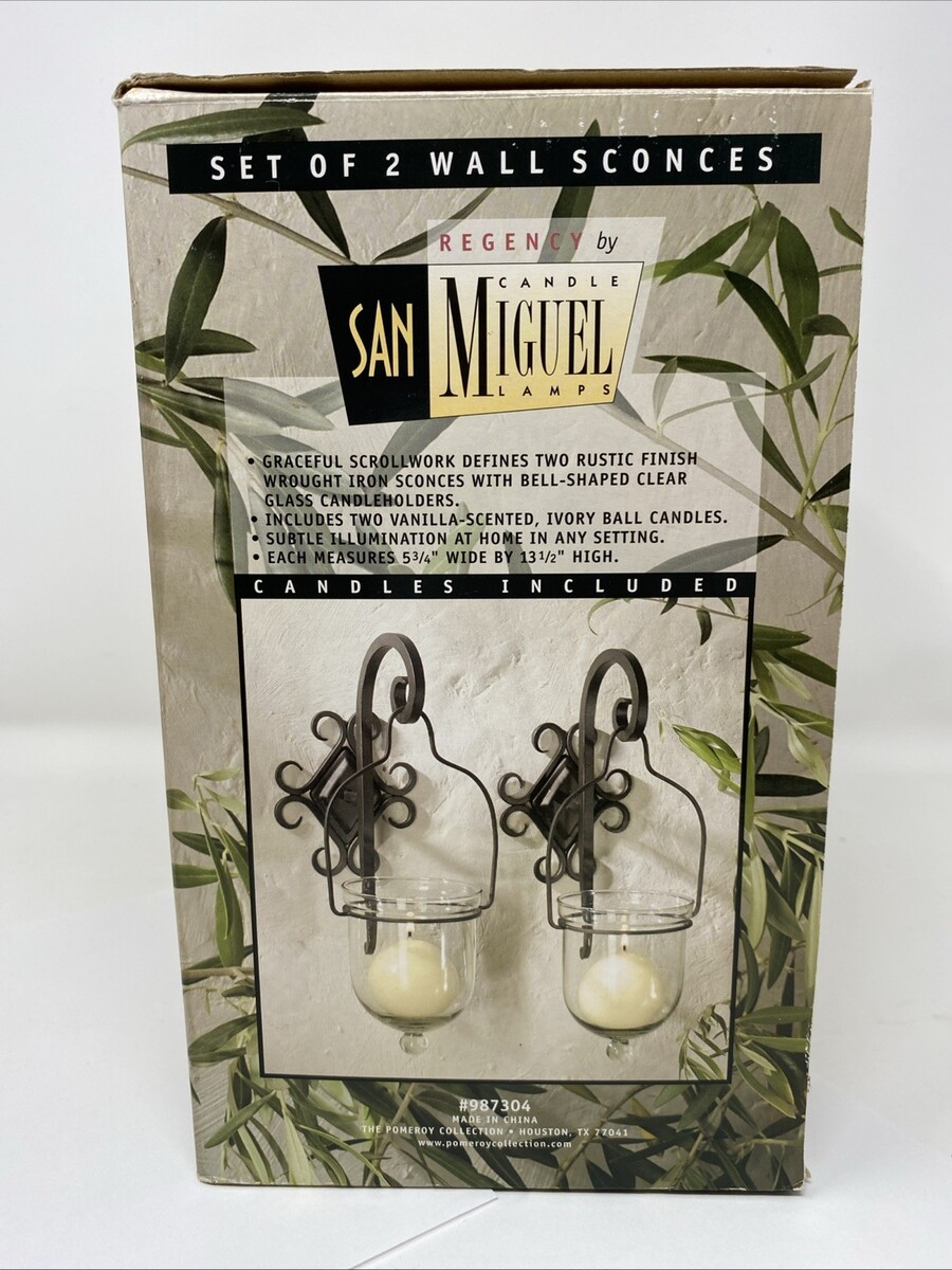 San Miguel Candle Lamps Wall Sconces NEW Set of 2 Wrought Iron Regency Bell-Shaped Clear Glass Candleholders Subtle Illumination Each Measures: 5.75" x 13.5" New in Box See all photos. Non-smoking home. Be sure to check out my other items! I am happy to combine shipping charges. Please note: My goal is always 100% complete customer satisfaction. If for any reason you feel your item arrives "not as described," please contact me before leaving feedback. I am a trading assistant. I can sell items for you! |KES-SIS|