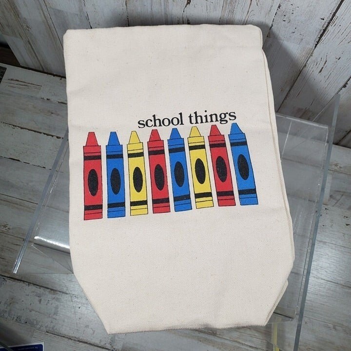 School Things Canvas Drawstring Lined Bag Crayons Red Blue Yellow Student