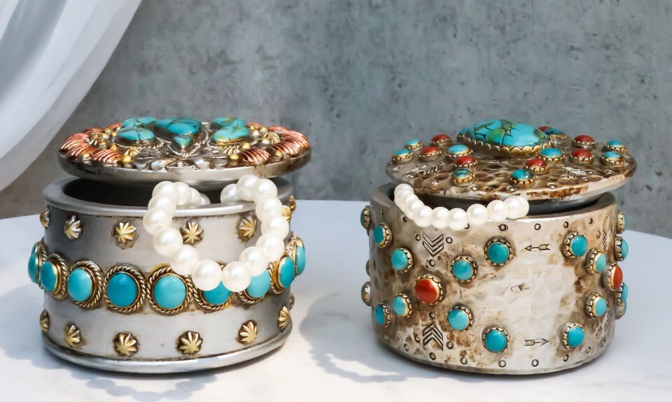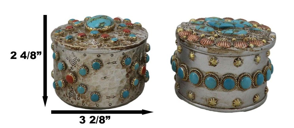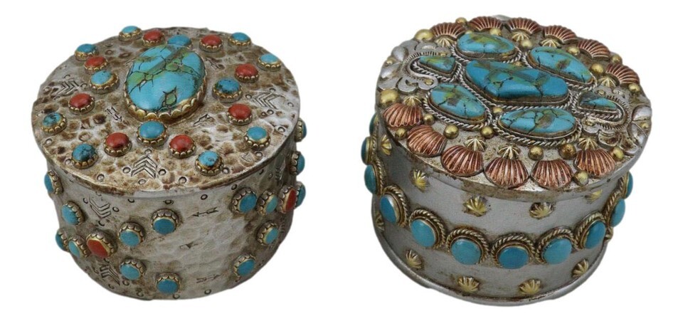 ? These Southwest Turquoise Gemstones Art Jewelry Boxes are made of polyresin, hand painted and polished individually. Colors may vary slightly from photos.