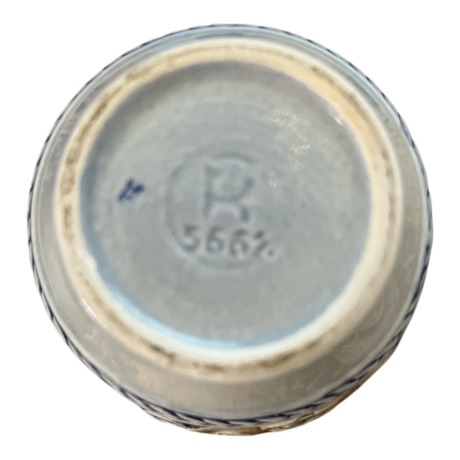 A rare variation of traditional German salt-glazed pottery, this set of 3 stoneware wine cups features a striking raised grapevine design with brown and cobalt accents?a less commonly seen color combination. These sturdy cups are marked with mold number 566oe and various production stamps, most likely from a mid-20th century Westerwald manufacturer such as Wick-Werke or Gerz.