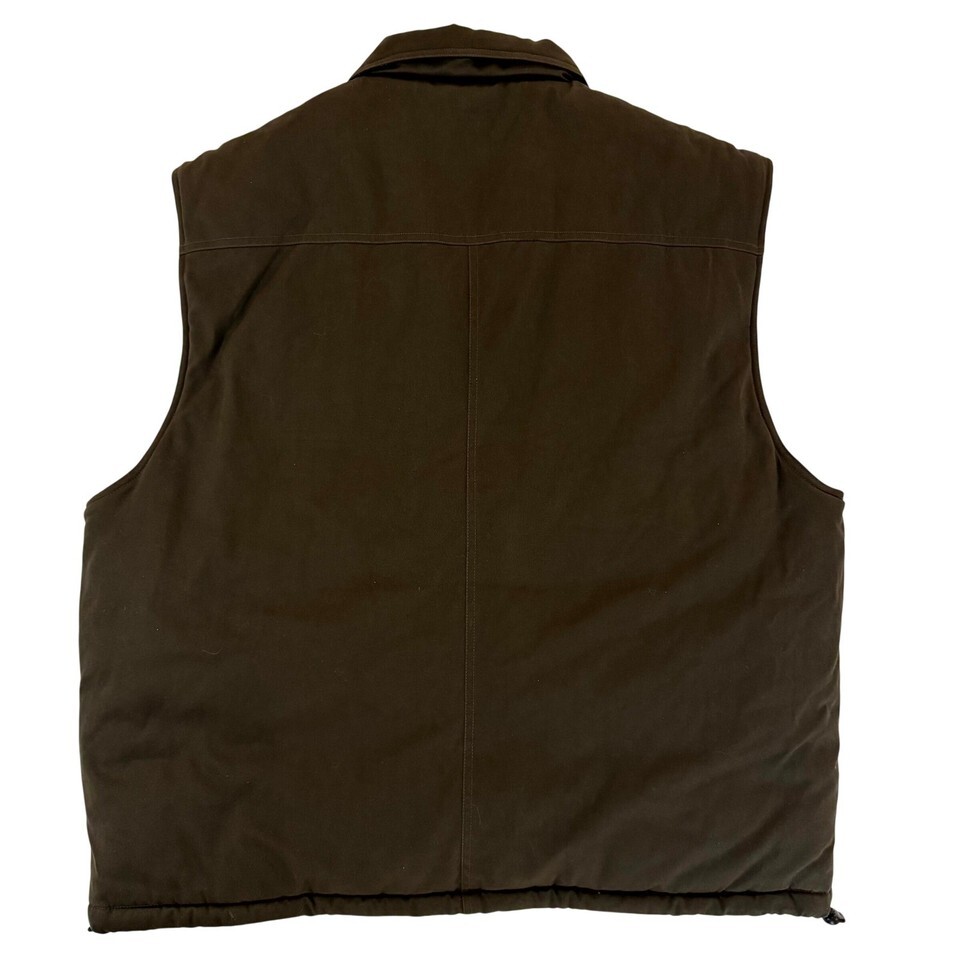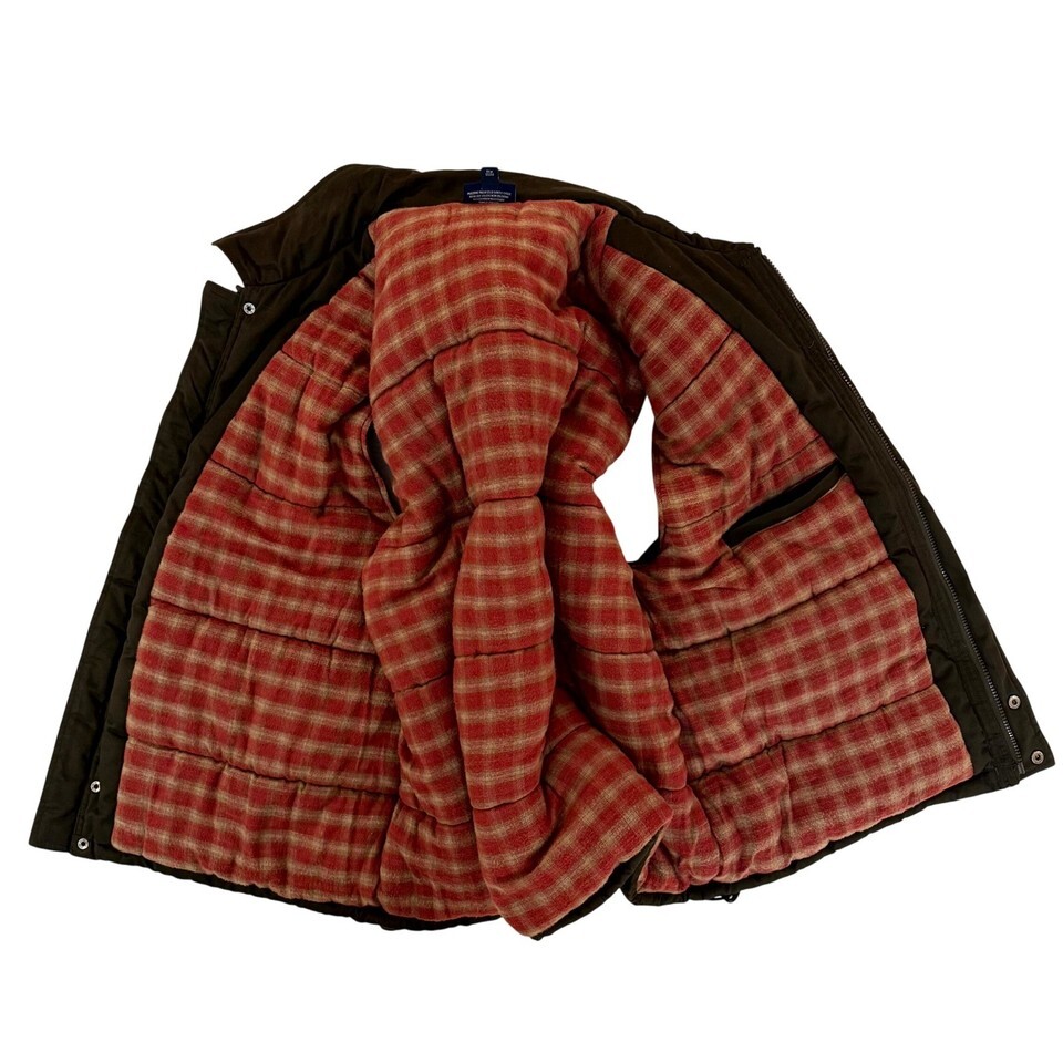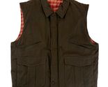 Excellent pre-owned condition, possibly unworn (no tags). Classic heavy-duty vest by Shaver Lake ? durable brown shell with quilted red plaid flannel lining. Snap-button front with hidden zipper closure, four exterior pockets, and adjustable drawstring hem to snug the waist.