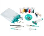 Kit Includes 43 Pieces: 3 pc Screwdriver Set, Angled Lint Brush, Thread Snips, 2-in1 Magnifier/Needle Threader, 10 Spools (110yd each), 100 percent polyester thread, Magnetic Pin Dish, 20 Ball Head Pins, Angled Tip Tweezers, Bodkin, Tape Measure, Seam Ripper, Compartment Storage Tray, Zipper Storage Pouch.