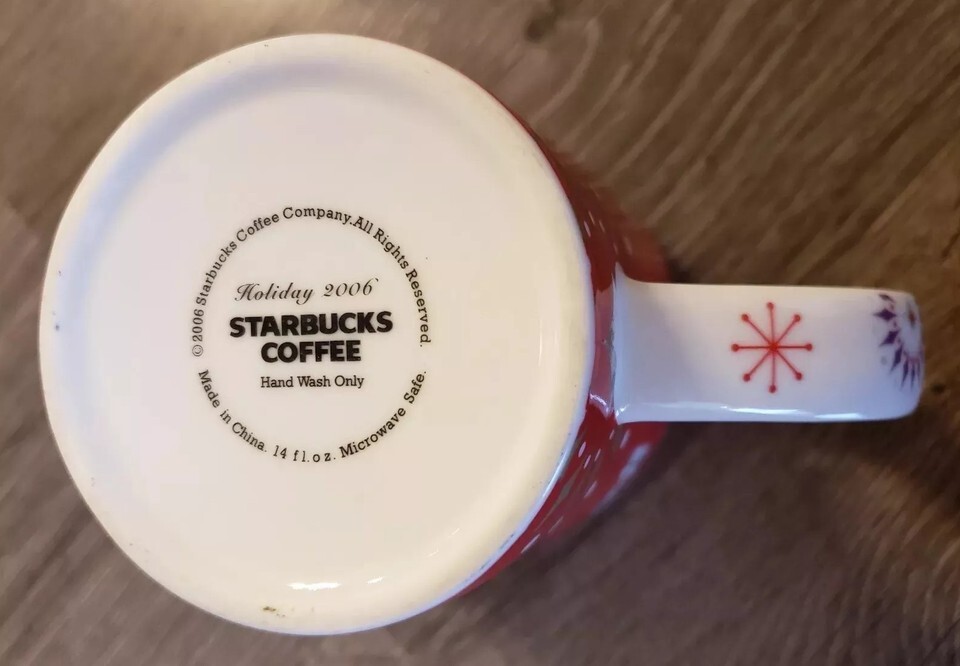 Starbucks Coffee Mug - Christmas/ New Year's Eve/ Holiday 2006 4 1/4 inches tall Top diameter 3 3/4 inches 14 fluid ounce capacity Microwave Oven Safe Excellent condition No chips, cracks or nicks No crazing