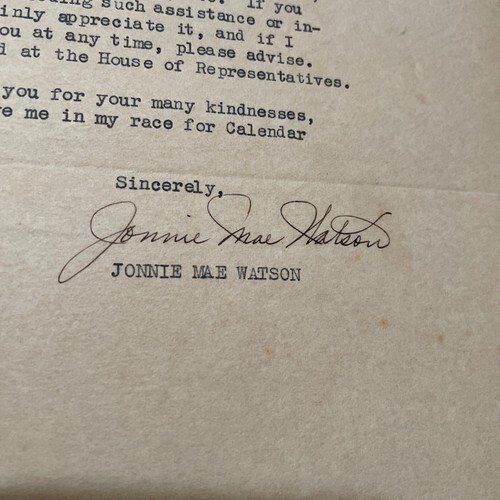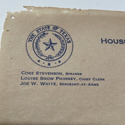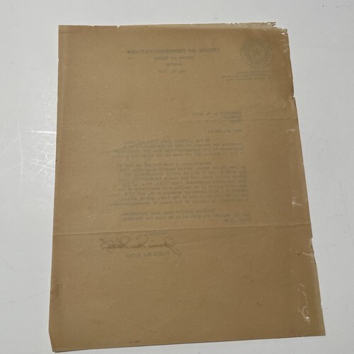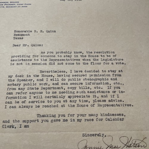- State of Texas House of Representatives Letter 1935 Jonnie Mae Watson