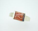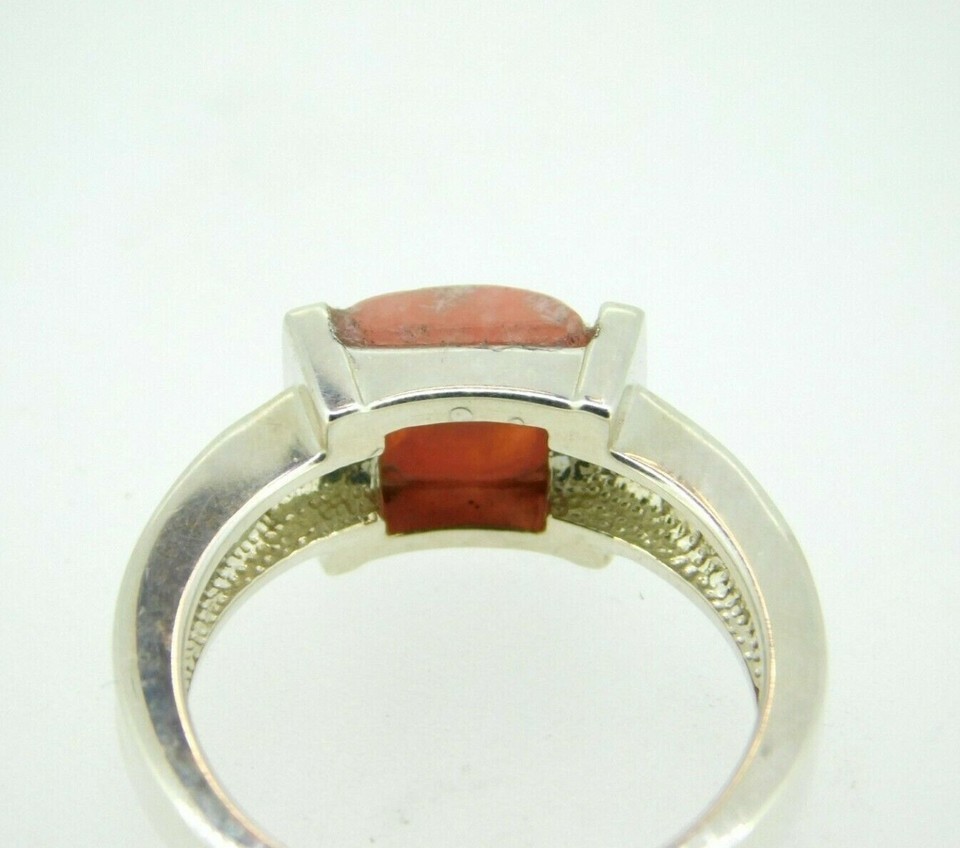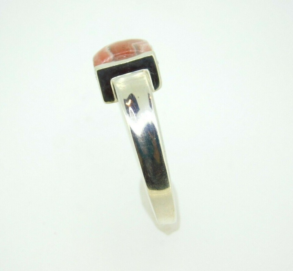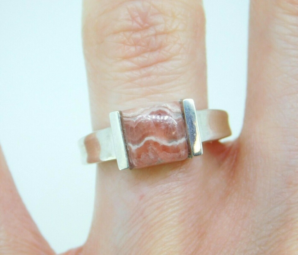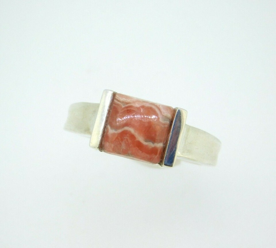 Sterling ring featuring a square rhodochrosite cabochon measuring about 8mm. The rhodochrosite has peachy-pink bands. The ring fits a size 7 finger and weighs 3.6dwt. It is a contemporary piece. Marvelous!