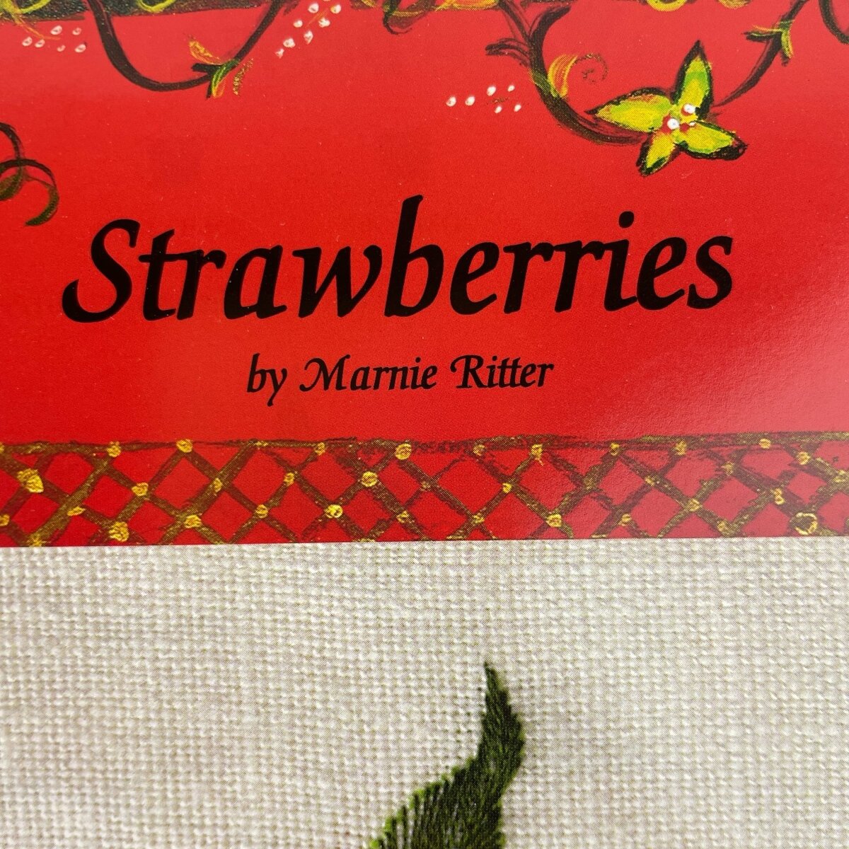 This hand embroidery kit titled "Strawberries" is designed by Marnie Ritter and published by Accord Publishing Ltd. It features a charming strawberry design intended for surface embroidery. The finished stitched piece measures 3.75" x 3.75", and the framed piece size is 9" x 9". The frame design is credited to Milena Kirkova.