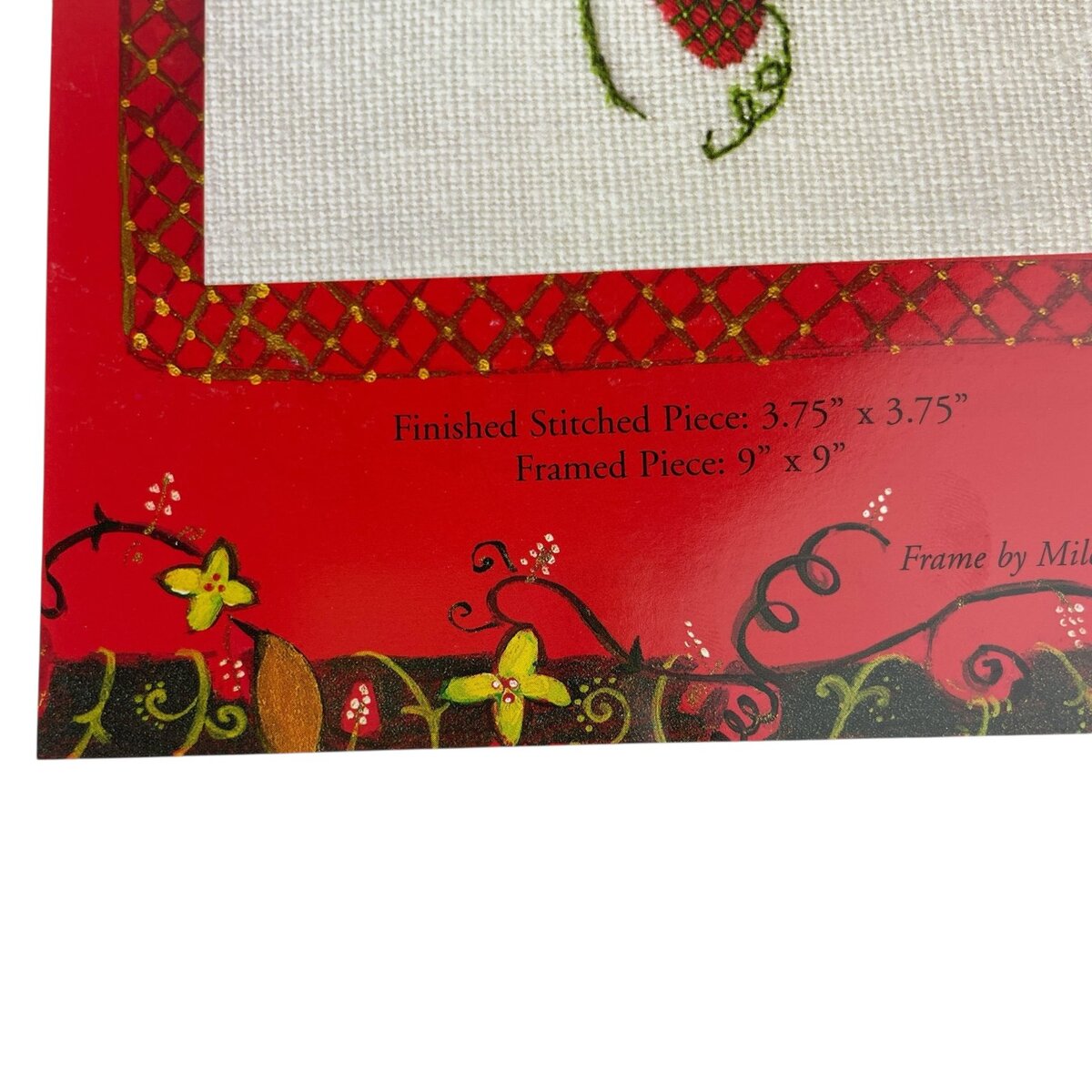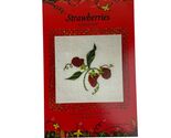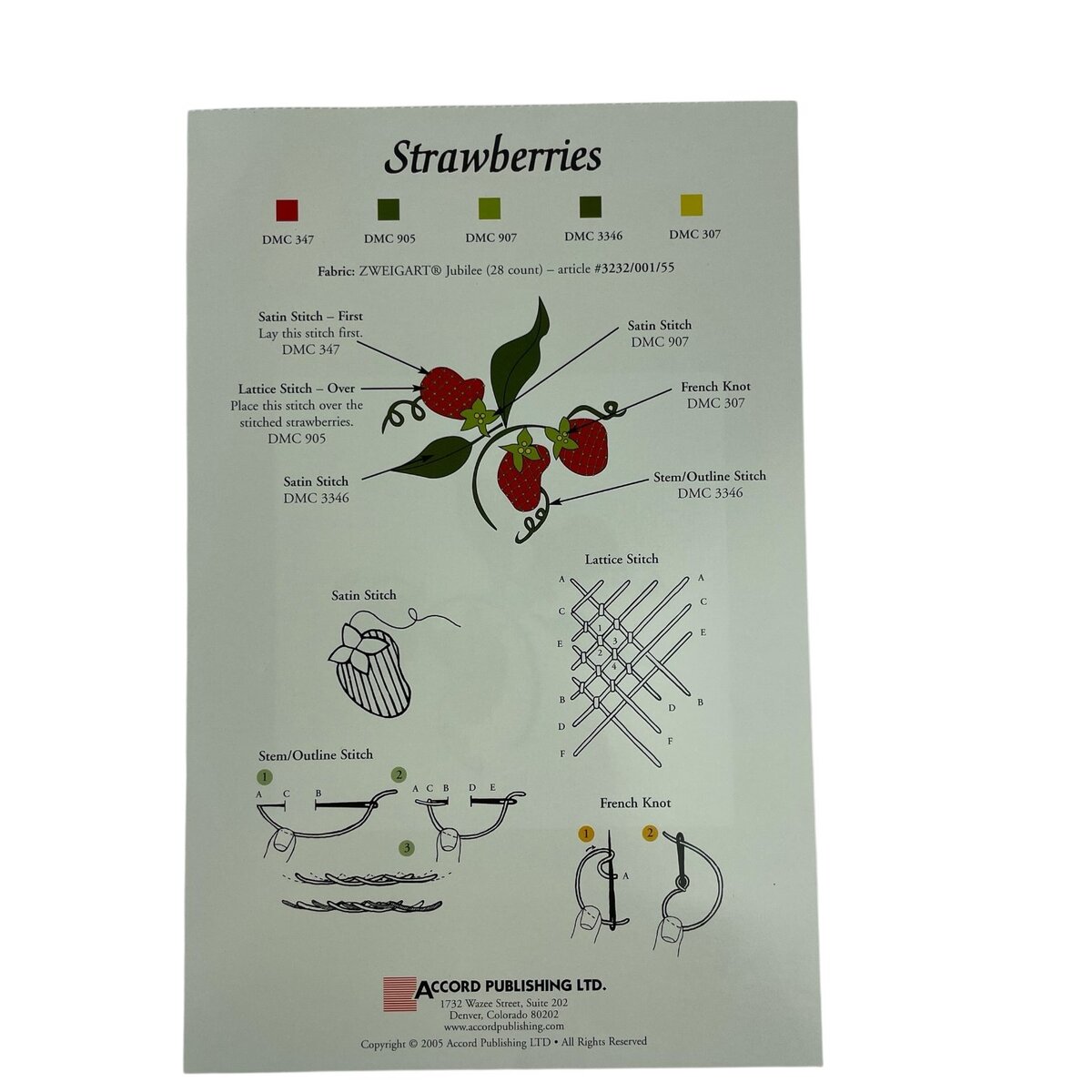 The kit includes a piece of Zweigart Jubilee fabric (28 count) with pre-printed outlines of the design, which measures approximately 3.75" square for stitching. The kit requires DMC color threads DMC 347, 905, 907, 3346, and 307, with detailed stitch instructions for Satin Stitch, Lattice Stitch, French Knot, and Stem/Outline Stitch. The back includes clear stitch guides with diagrams. Also included is a decorative red paper mat piece with strawberry and floral motifs to complete the finished artwork.