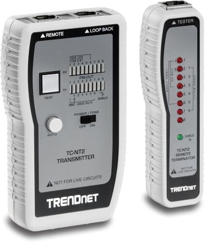 Product description: Shipping Depth: 6.7 Shipping Height: 2.0 Shipping Width: 4.6 Master Pack Qty: 50 General Information Manufacturer: TRENDnet Manufacturer Part Number: TC-NT2 Brand Name: TRENDnet Product Model: TC-NT2 Product Name: Professional Cable Analyzer Marketing Information: The TC-NT2 is a convenient and comprehensive cable tester for network professionals. Its powerful and user-friendly features enable network installers to accurately check pin configurations of various voice and data communication cables. The TC-NT2 includes a master unit that transmits test signals to its corresponding remote terminator to verify cable reliability. It checks continuity and displays wiring configuration up to 300 meters of cable installation. With the unique feature of the audio tone generator, the TC-NT2 identifies and troubleshoots faulty cables to assure proper pin and wiring structure. Technical Information Test Services: Tests Pin Configuration of 10/100/1000BaseT, 10Base2 (coax), RJ-11/RJ-12/RJ-45, EIA/TIA-356A/568A/568B, and Token Ring Cables Tests USB and IEEE 1394 cables with optional adapters Tests the grounding on shielded (screened) cable Verifies cable continuity, opens, shorts, and miswires Auto-Scan or Manual-Scan mode Length Measurement: 984 ft Physical Characteristics Height: 1.1 Width: 2.7 Depth: 4.5 Weight (Approximate): 4.00 oz - Master Unit Weight (Approximate): 2.00 oz - Remote Terminator Warranty Standard Warranty: 1 Year Repair/Replace