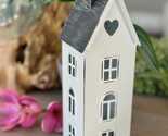 A pretty house shaped lantern with heart and window cut outs with a distressed finish and grey roof. Can be used with tea lights or LED battery lights. NOT included.
