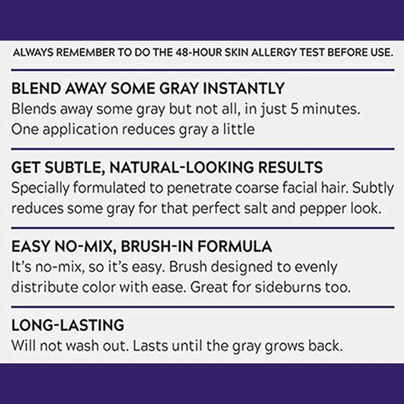 Designed specifically for coarser facial hair, Just For Men touch of gray mustache and beard gets rid of some gray, but not all. It works gradually. The innovative formula reduces gray without getting rid of it completely. The applicator brush is specifically designed for facial hair and lets you control the application. With each application, Touch of Gray Mustache and Beard reduces the amount of gray. The change is subtle. And even with repeated applications it won't get rid of all the gray. It's gentle and long lasting -- there's no ammonia or peroxide. And yet the natural look lasts until you gray grows back. We believe in freedom of grooming. Men should feel free to look however they wish to look-with or without gray hair. When men want to enhance, reduce or get rid of their gray, they come to Combe. Our Just For Men brand is No.1 in the world, because men trust us to create products that deliver superior, natural-looking results. No other brand is 100% dedicated to giving men easy options to groom away their gray so they can look the way they want to look every day. Made in the USA.