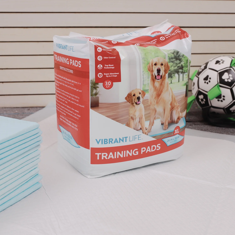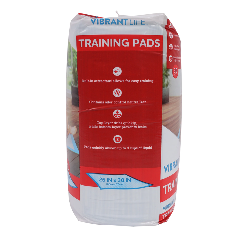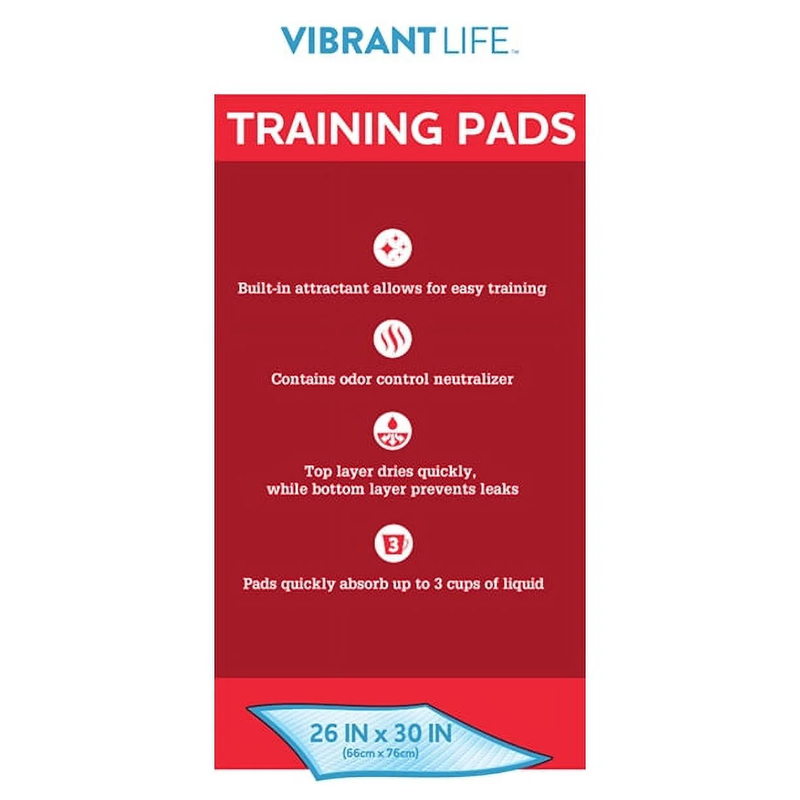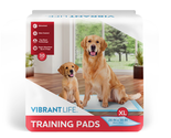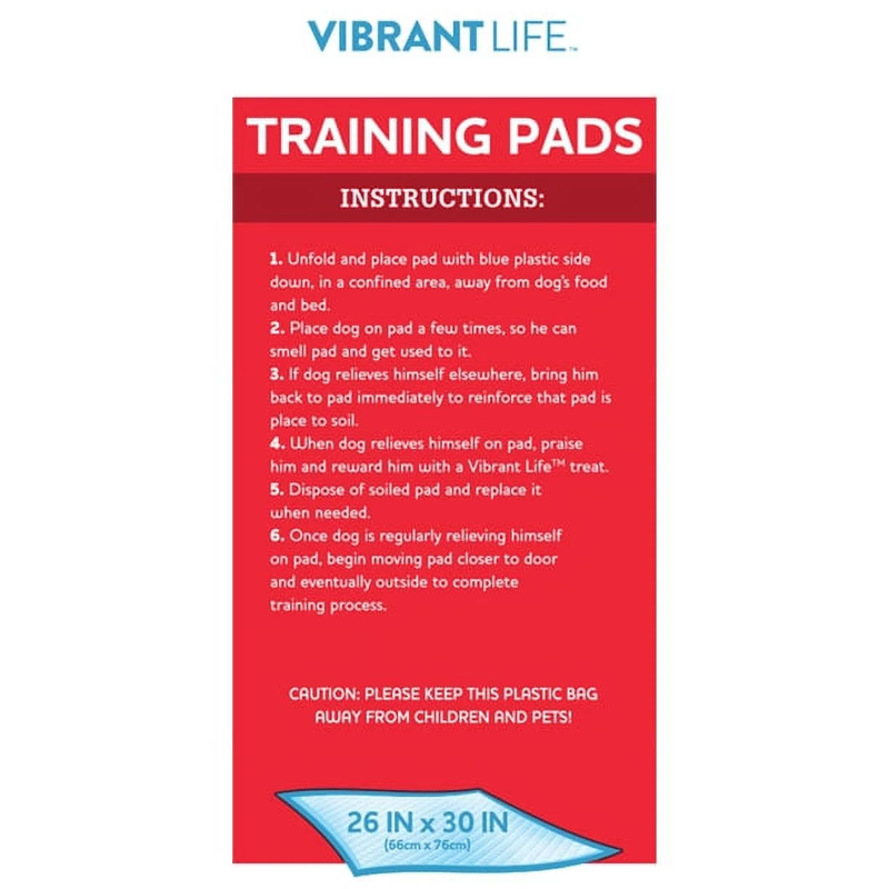 Keep your floors safe with the help of the Vibrant Life Training Pads. Their built-in attractant allows for easy training, and they contain an odor neutralizer. The top layer dries quickly, while the bottom layer prevents leaks. Each pad can quickly absorb up to two cups of liquid, keeping your floors safe and dry. When you have welcomed a brand-new puppy to your home, being proactive is a must, and these pads can help. Simply unfold and place the pad with the blue plastic side down, in a confined area, away from your pooch?s food and bed. Place your pup on the pad a few times so he can smell it and get used to it. If he happens to relieve himself elsewhere, bring him back to the pad immediately to reinforce that the pad is the place to soil. When your good boy relieves himself on the pad, praise him and be sure to reward him with a Vibrant Life treat! Make house training a little easier and keep your floors dry with Vibrant Life Training Pads. Help your pets live the Vibrant Life! Our products are specially crafted with one goal in mind, seeing your pet at its very best. With a variety of offerings designed to keep animals healthy, happy and energized, Vibrant Life stands out as the brand that truly puts your pet first.
