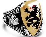 ...Tudor Lion shield ring, enameled black Lion,1/2 pt.Ruby eye Bronze shield top, 3-D Sterling Silver Oak leaves frame bottom of shield, Sterling silver worked fluted sides, and shank(bottom) with 3-D Knight helmet side accents HEAVYBUILT/USA