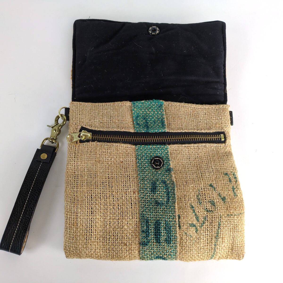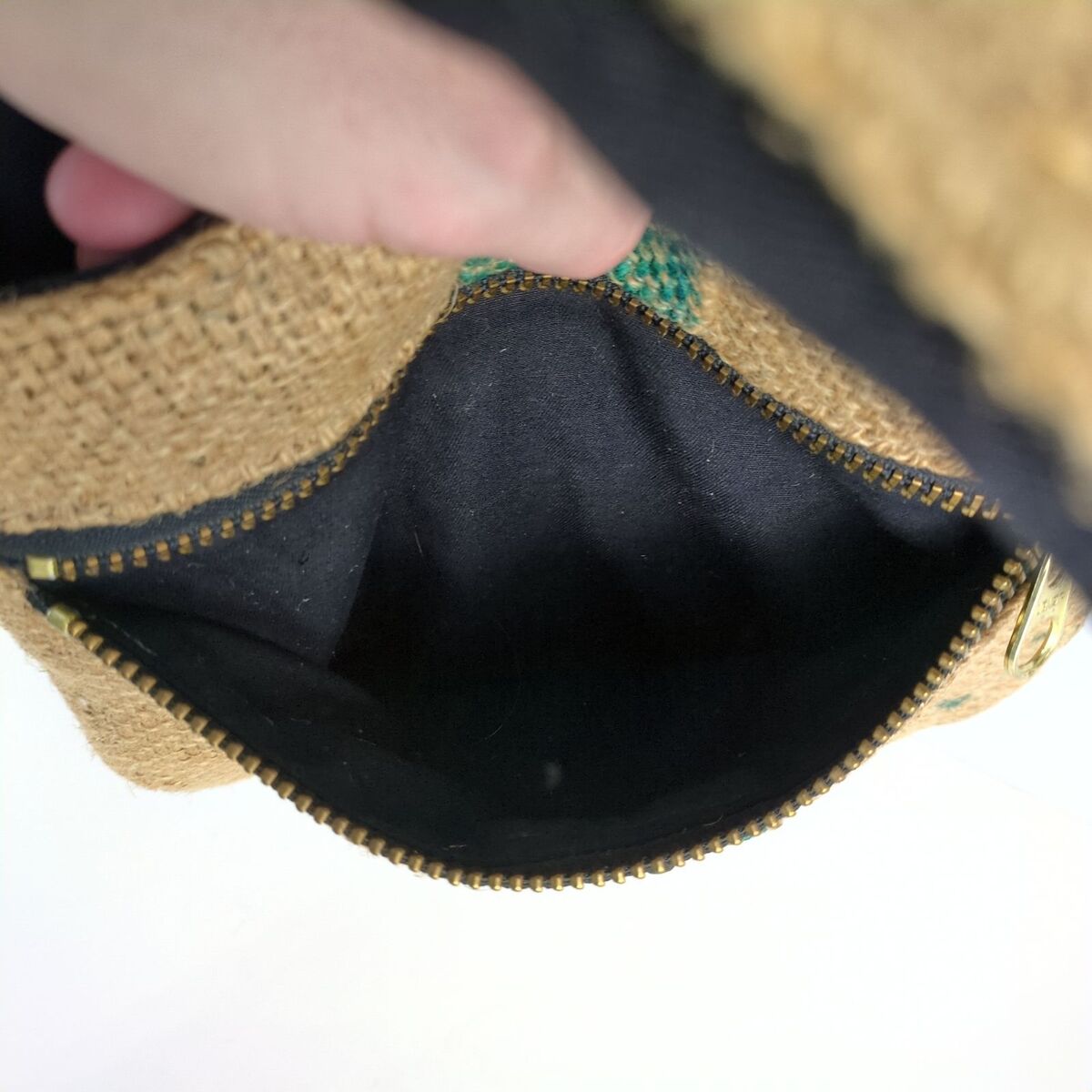 Features: Genuine Italian leather removable handle strap, snap closure, upcycled burlap coffee sack outer, twill cotton fabric lining, front zippered compartment, brass hardware, side D-rings to add a shoulder strap (not included)