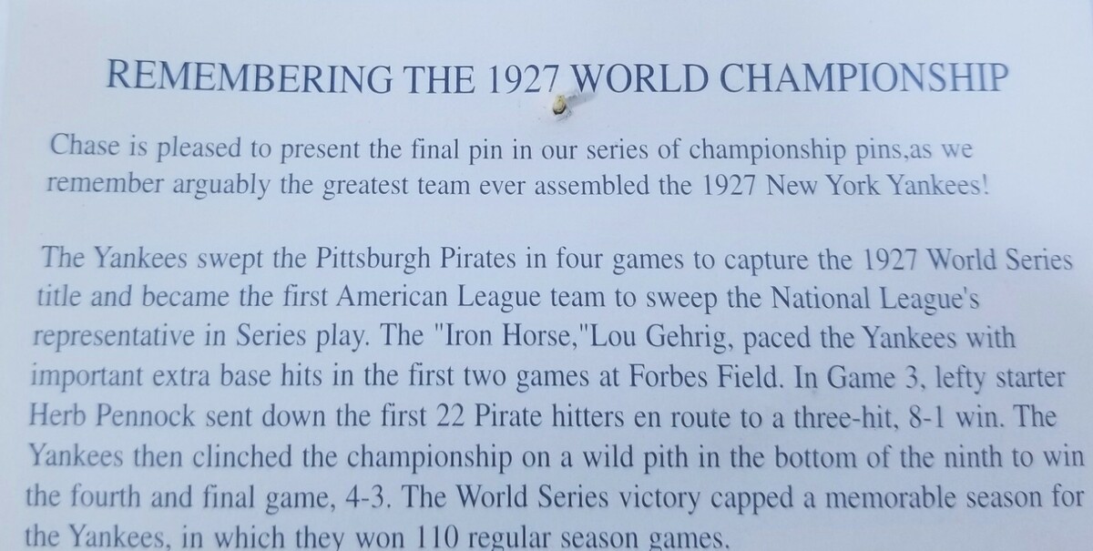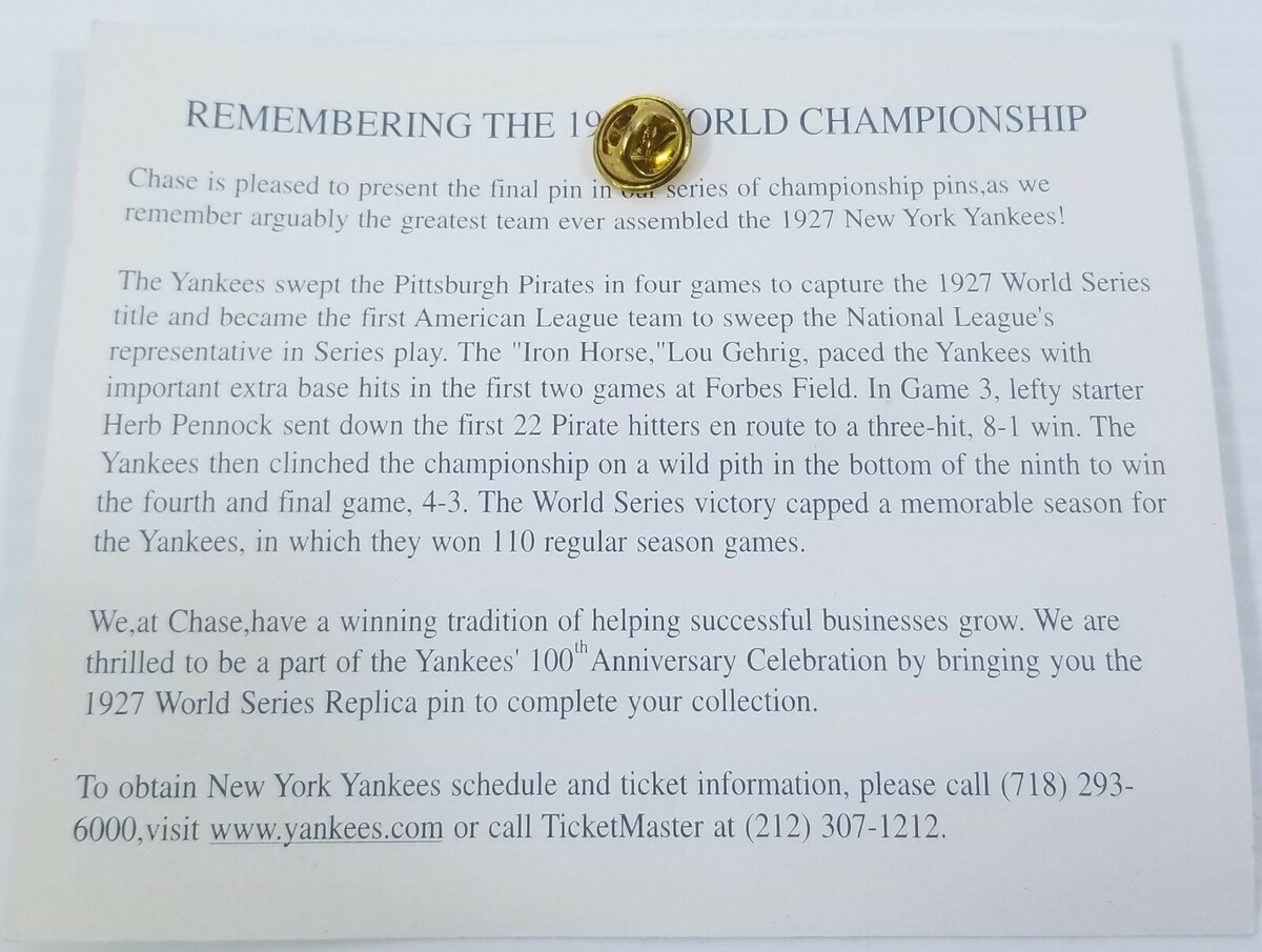 New York Yankees World Series Collector's Pin Yankee Stadium give-away on September 26, 2003 Final pin in the Chase championship pin series American League World Series commemorative pin Limited to those that attended the game that day. Pin is un-used old stock on original card. It has been in storage for some time, therefore may show possible slight sign of age but overall great shape.