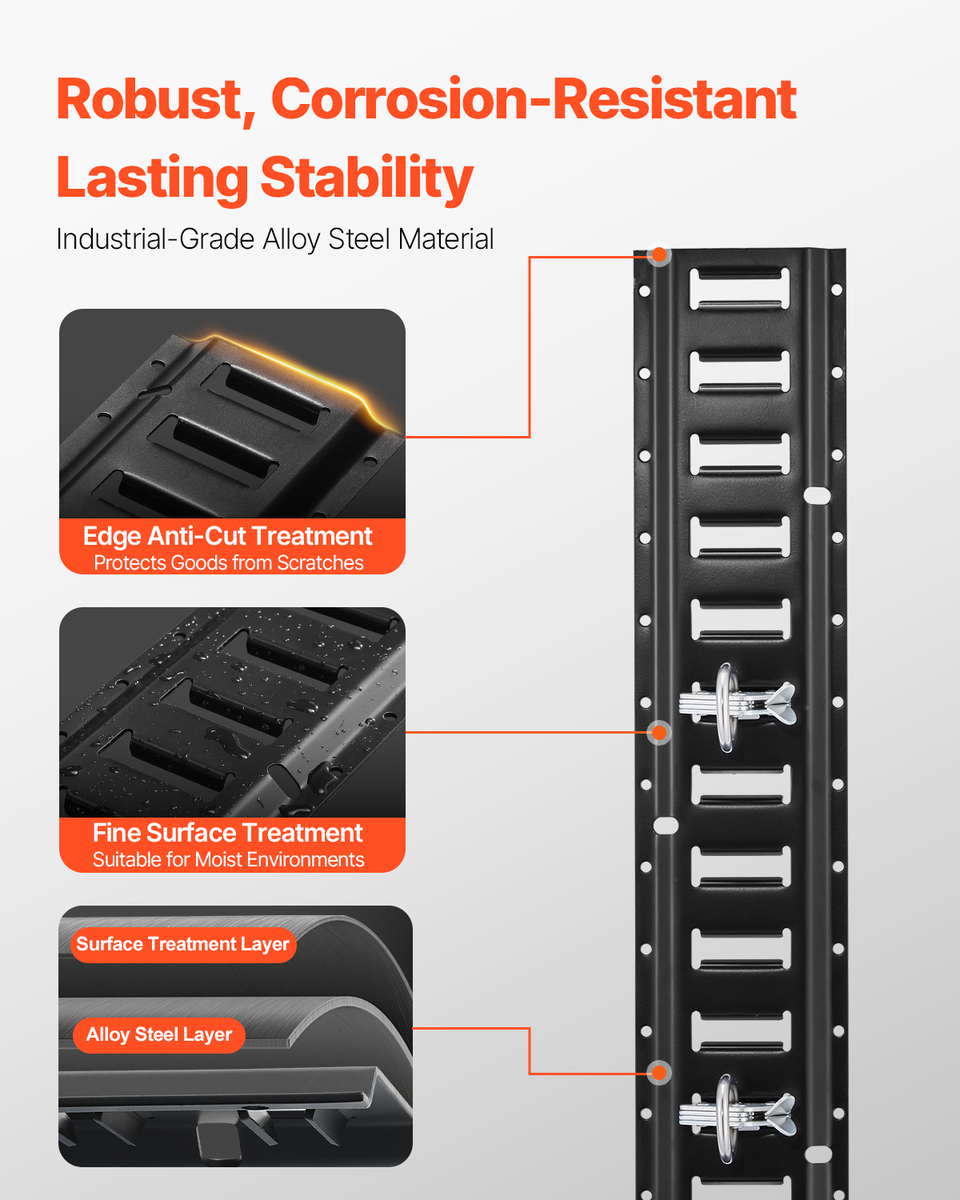 Built Tough: Crafted from industrial-grade solid steel with a fine powder coating, these E-track tie-down rails are built to last. No rust, no corrosion – just reliable performance. This material and surface treatment promise a long service life, even in harsh, damp environments, without worrying about quality issues.