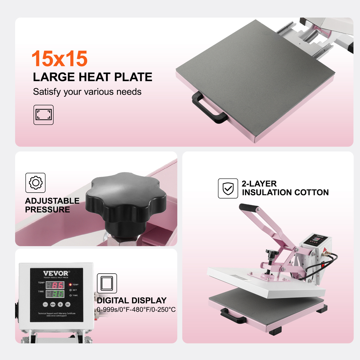 - VEVOR Heat Press, 15 x 15 in, 2-Layer Insulation Cotton, Plate-Press, 110V, Pink