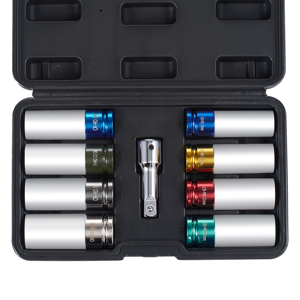 1/2 Inch Lug Nut Impact Socket Set: This lug nut socket set includes 4 SAE sizes 3/4in, 13/16in, 7/8in, 15/16in and 4 metric sizes 17mm, 19mm, 21mm, 22 mm, along with a 3" (76.2 mm) extension bar, making tire and brake replacements more efficient.