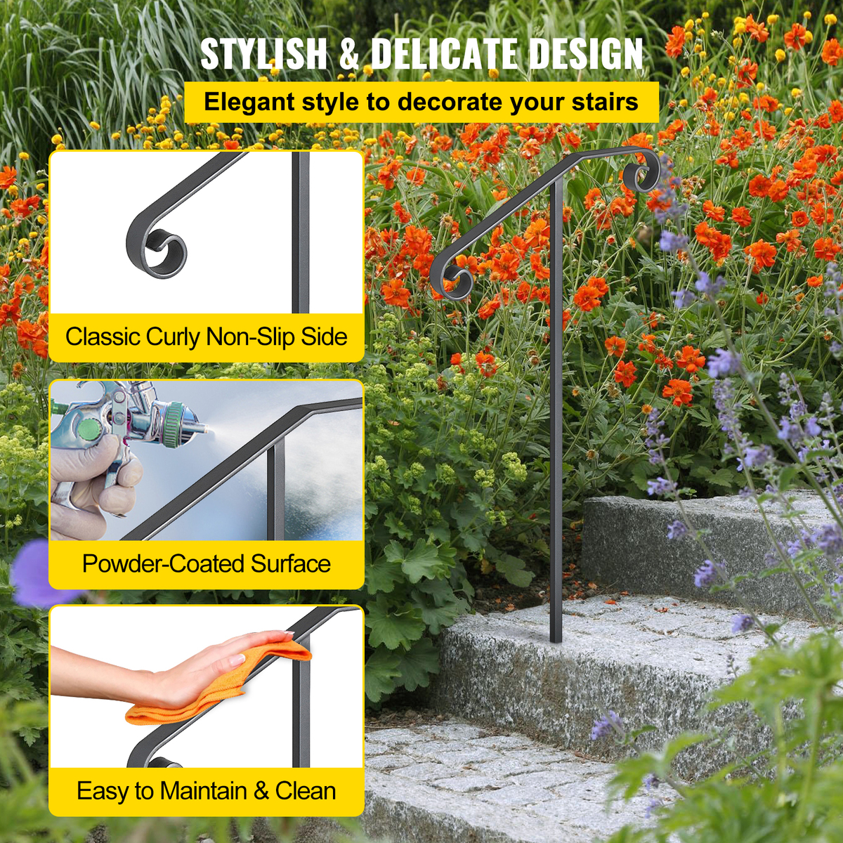 Stylish Delicate Design: Our single post wrought iron rail features a smooth powder-coated surface with gray for easy cleaning and maintaining. Its classic curly side design is beautiful and delicate, making it more ornamental and eye-catching.