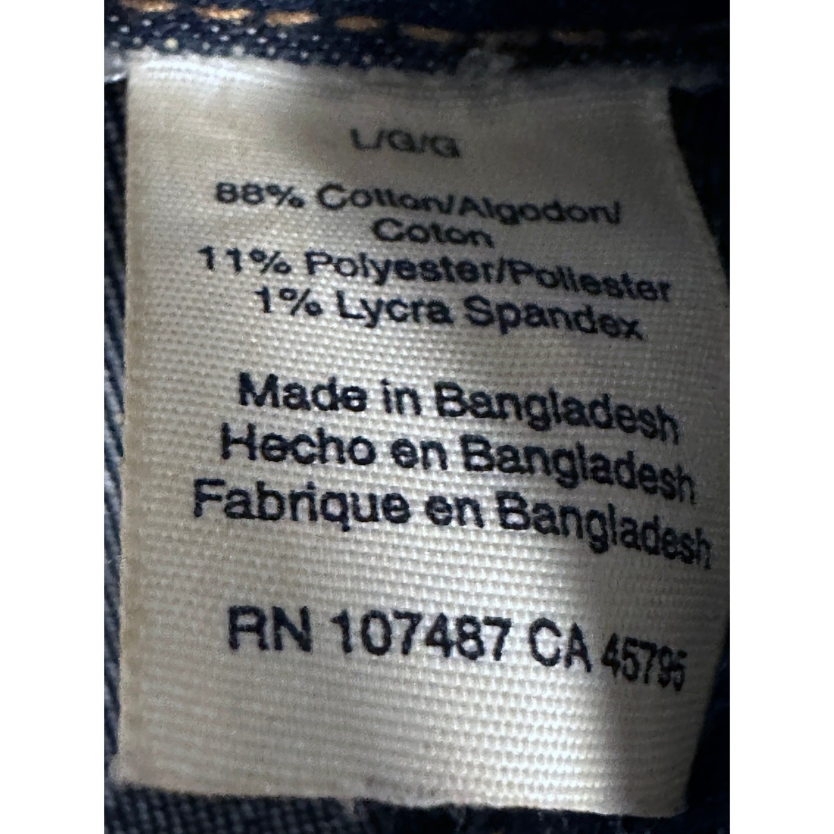 88% cotton, 11% polyester, 1% lycra; four-pocket front; side belts; vented back; RN 107487; Made in Bangladesh